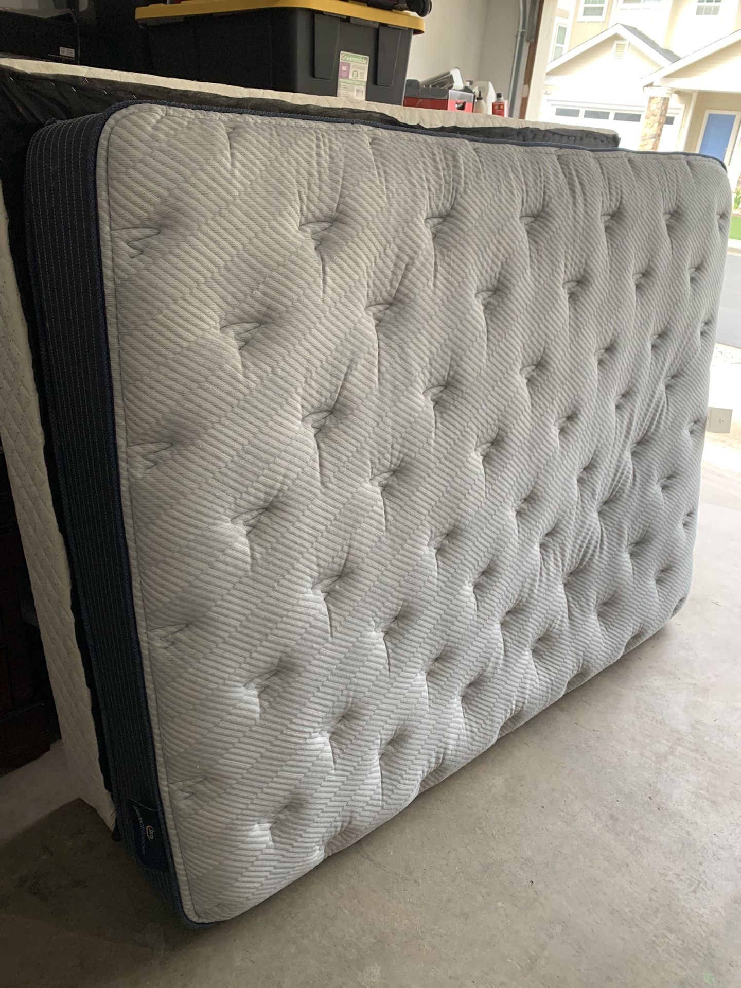 Almost new Queen size Serta mattress and box spring with new bed frame that has electrical outlet for your phone, purchased bed beginning of summer and only used for 3 months, moving and have no room to take with me