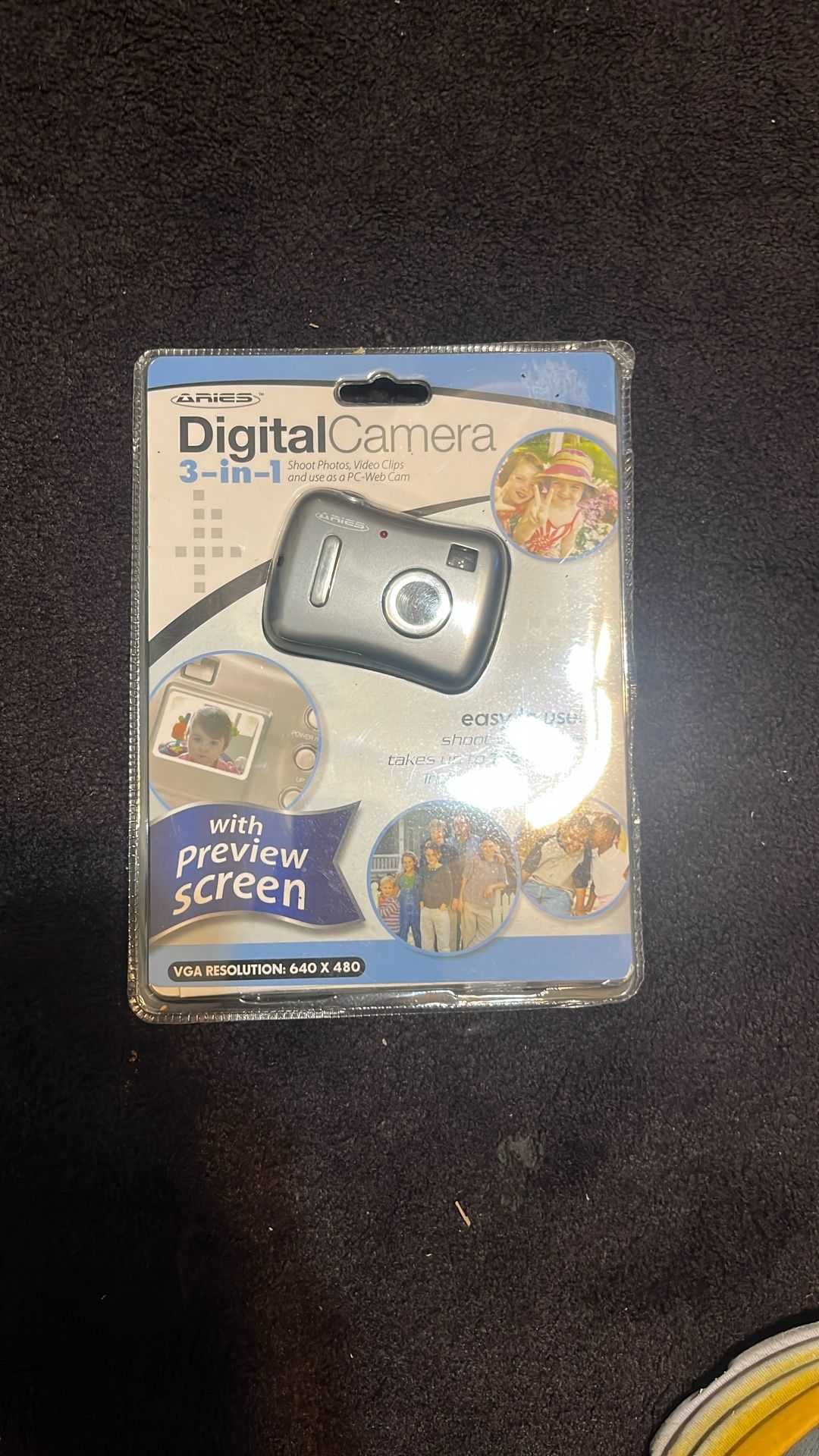 Brand-new, factory sealed Aries Digital Camera 3-in-1. Shoots photos, records short video clips, and can be used as a PC webcam. Great for a kid’s first camera, a retro/Y2K prop, or lo-fi projects. Features (from box): • With preview screen • VGA resolution: 640×480 • Stores up to 165 photos • Includes neck strap • “Easy to use!” packaging Included: sealed camera and neck strap (see photos).