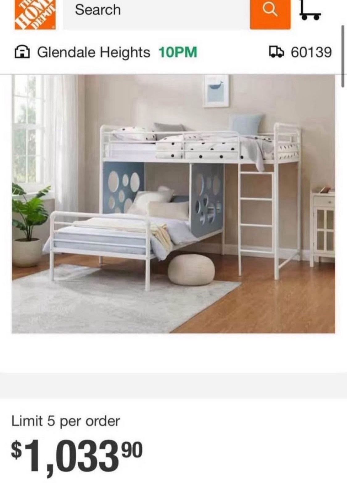 New White Bunkbed - Twin Size * New In the Box - Never Opened or Used / In Excellent Condition! * Dimensions: 78"L x 78"W x 60"H * Unique L shape offers a space-saving layout * Fun light blue circle-cutout panels lend a youthful look * Use it in your child’s room, guest room, or rental * Mattresses Not Included * Easy to assemble * Trusted Seller / Read/ See My Reviews! Follow Me For Amazing Deals Listed Daily
