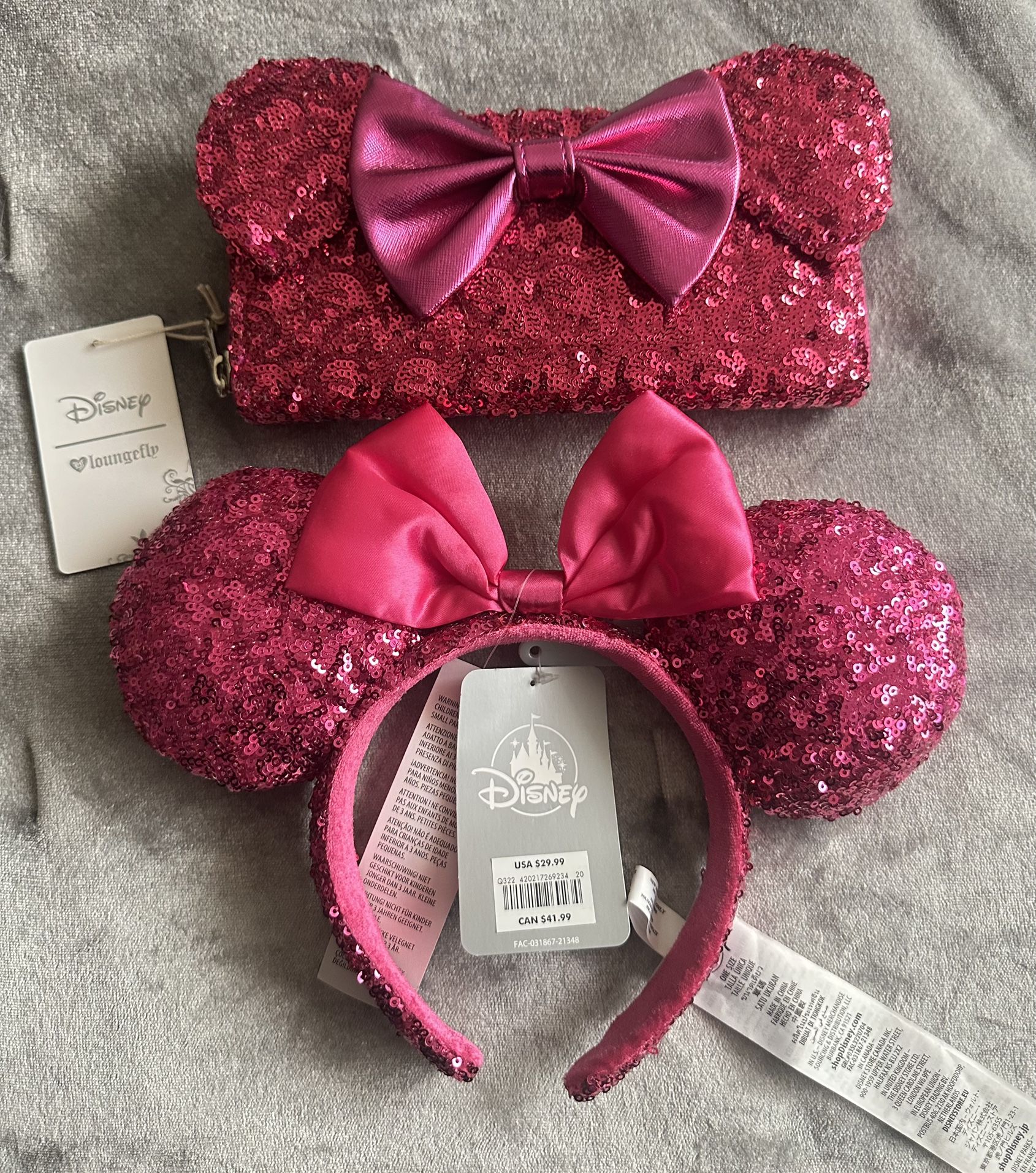Disney Loungefly Minnie Mouse Hot Pink Sequin Long Wallet And Headband