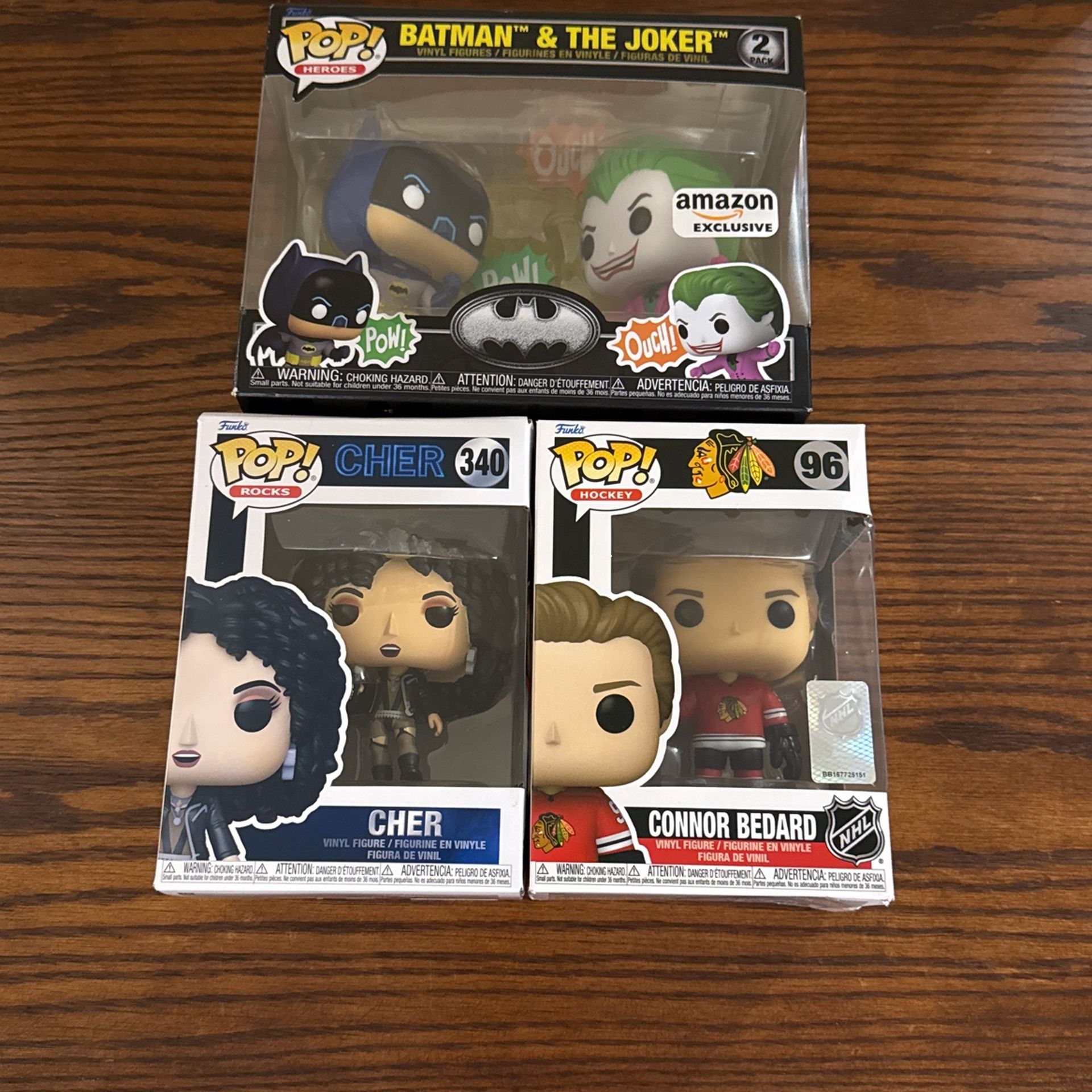 Selling all three brand new sealed Funko Pop -Connor Bedard Blackhawks -Batman and The Joker -Cher Message offers! Thanks