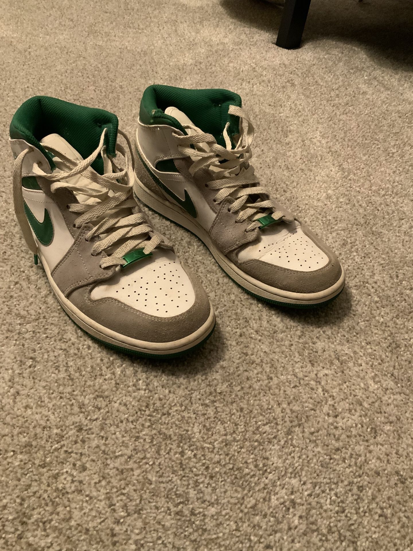 Downsizing my collection. These are the Air Jordan 1 Mid SE in the "Grey Pine Green" colorway (Style: DC7294-103). Condition: • Mildly Worn: The soles are in great shape with almost no "heel drag" and the star pattern on the toes is still clearly visible. • Note: There is a small blemish/minor tear on the green inner lining of the left shoe (see photos). • Leather and overlays are clean and well-maintained. • No original box included. Price: $65 (Price is negotiable, but no lowball offers please).
