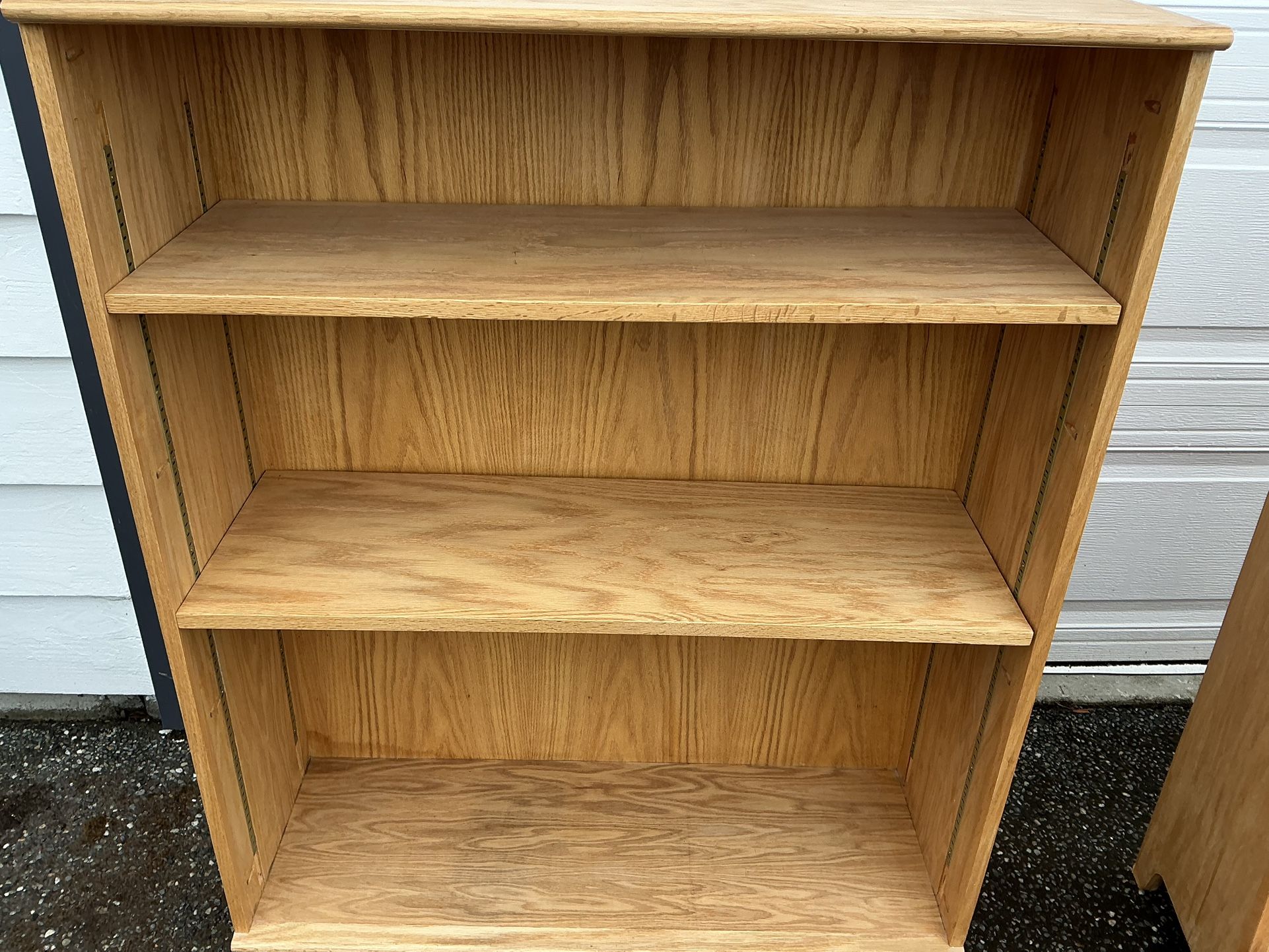 Two bookcases with casters, three shelves, shelf brackets, and two shelf supports. Could be painted. 4ft high, 13” deep, 3 ft long