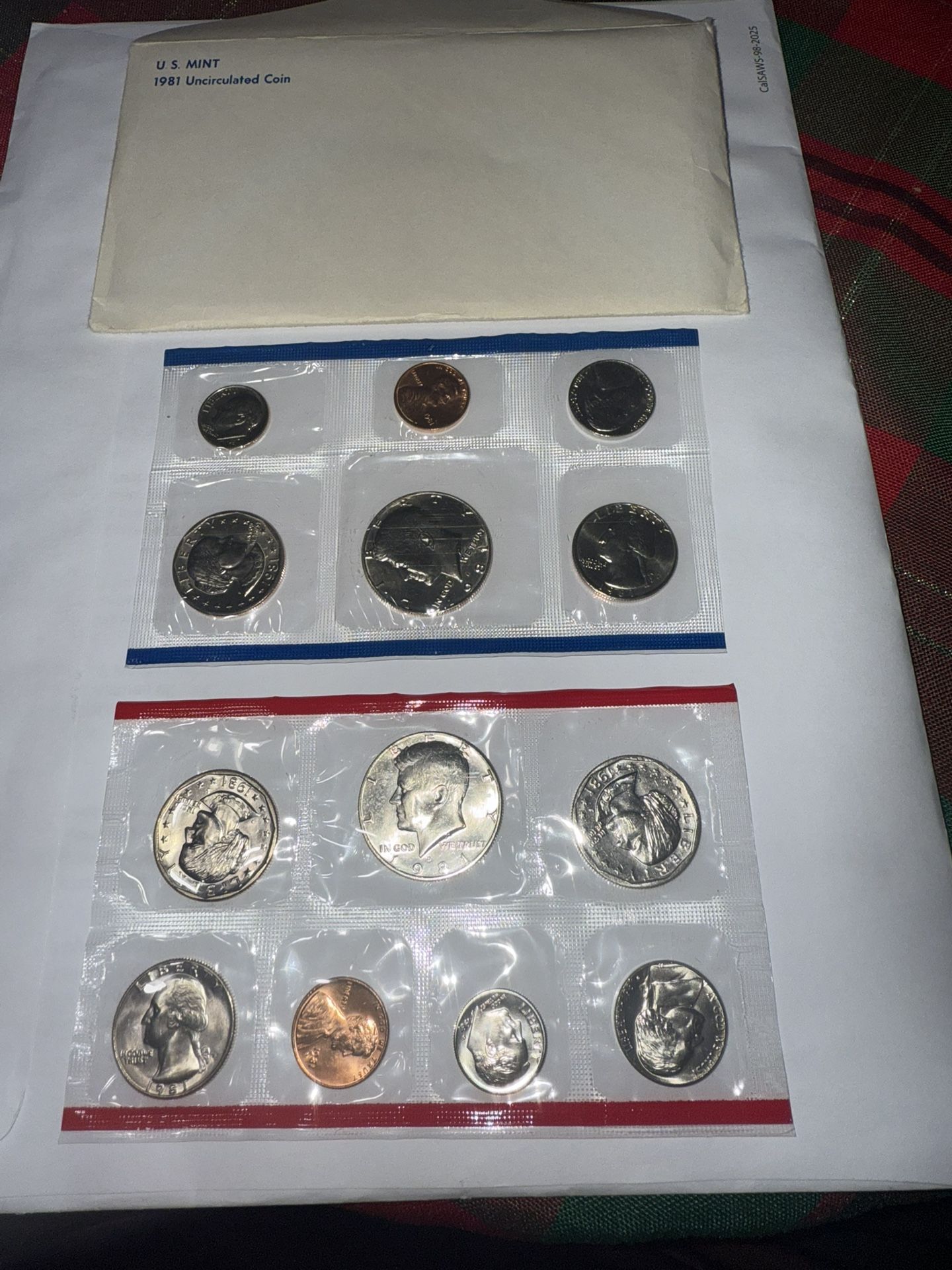 1981 Uncirculated Susan B Anthony Dollars from Philadelphia, Denver and San Francisco Kennedy Half Dollar Philadelphia and Denver, Quarters Philadelphia and Denver, Nickels Philadelphia and Denver and last but not least pennies from Denver and Philadelphia. Face value $4.82
