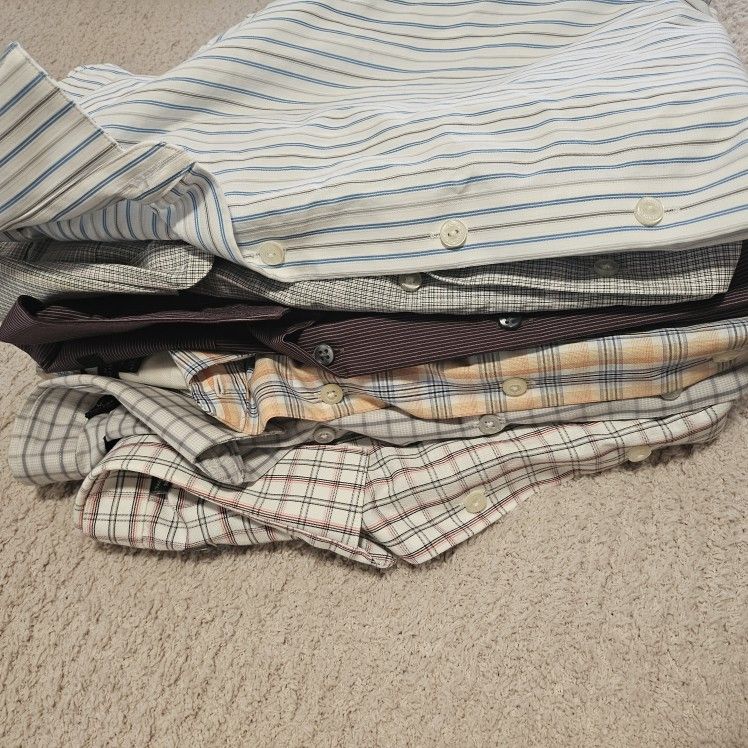 Lot of 6 shirts . Name brand shirts have no stains. Used maybe twice. 2 shirts have very small stain and one shirt has a tear by the cuffs. Slim fit medium. I can send more pictures if you'd like. Price is for all shirts!!
