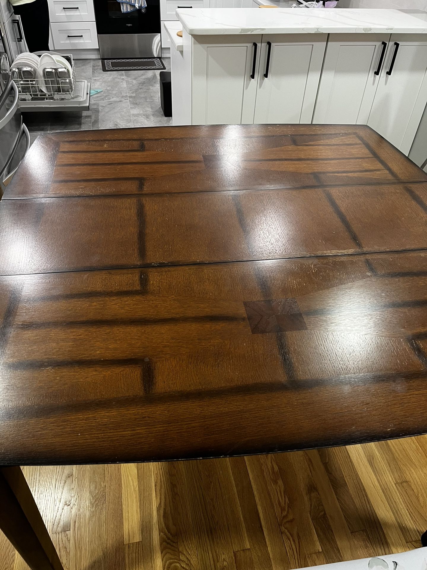 Dining table set with 6 chairs. In good condition with a small chip on one side Dimensions - 53” x 53” including leaf of 13.75” Table has few spots at one corner which can be easily polished. One of the chairs base seat has a small cut