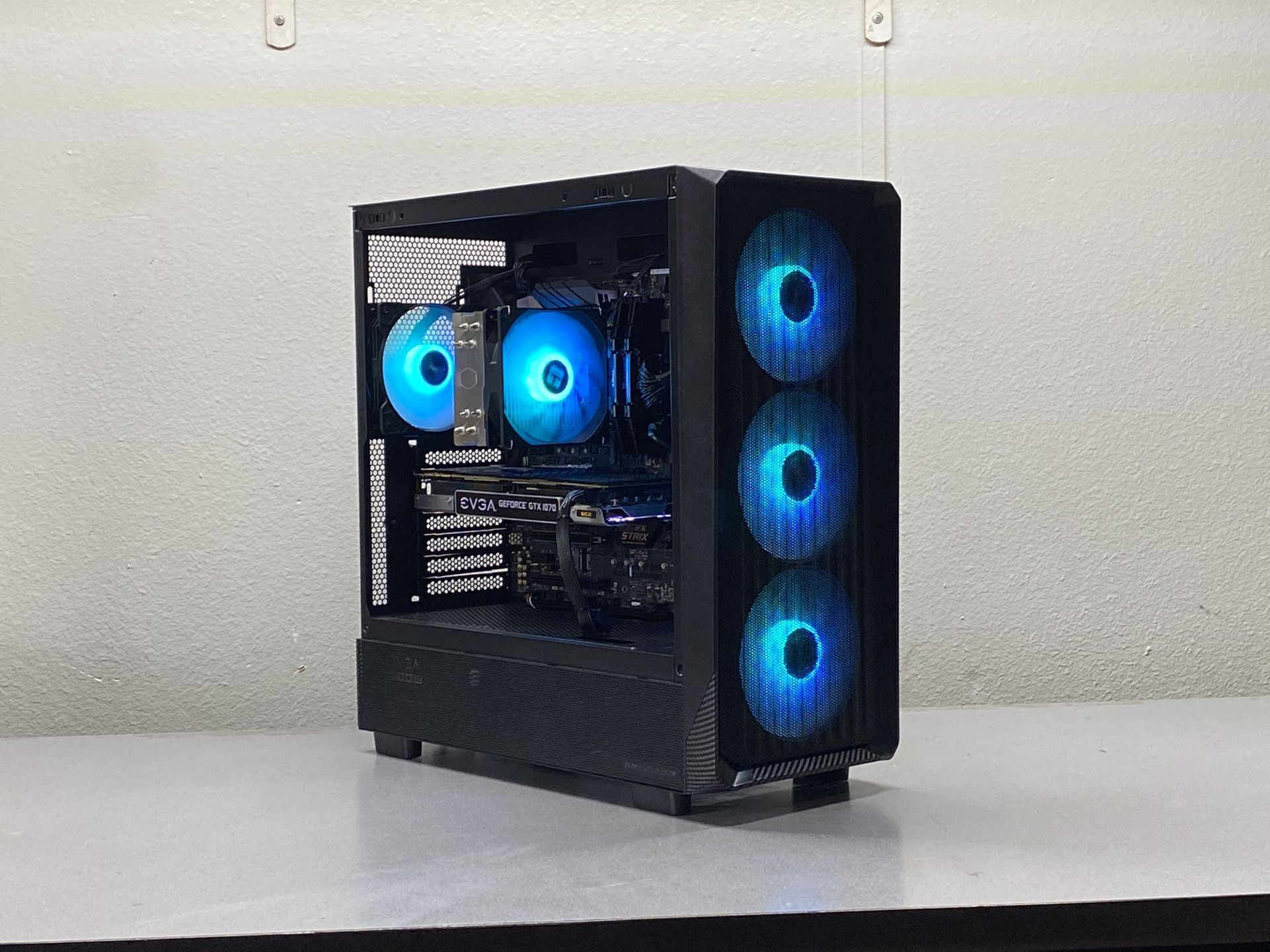 Good for running titles like Valorant, GTA V, Fortnite, Call of Duty, and more at up to 1080 100+ FPS (Depending on settings). Affordable and Reliable computers with blazing fast SSD storage! PC includes PSU Cable only and 2.4GHz Wi-Fi USB Specs: • AMD Ryzen 5 2600 6 Core CPU • Cooler Master Hyper 212 Spectrum V3 • Asus ROG STRIX B450-F GAMING ATX AM4 Motherboard • G.Skill Ripjaws V 16GB 3200MT/s Ram • Seagate XF1230 480GB SSD • EVGA SC2 Gaming iCX GeForce GTX 1070 8 GB • EVGA 600 W1 600 W 80+ Certified ATX Power Supply • Montech X5 ATX Mid Tower Case Windows 11 Preinstalled and Activated DM me for any questions