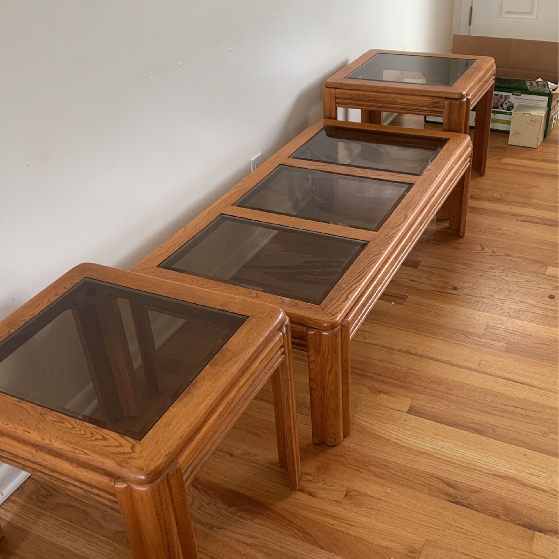 They are in good condition, no cracks nor chips. The 2 end tables are about 19”x19.5” and the coffee table is about 47.25” x 14.75” Taking offers, not selling them for $1