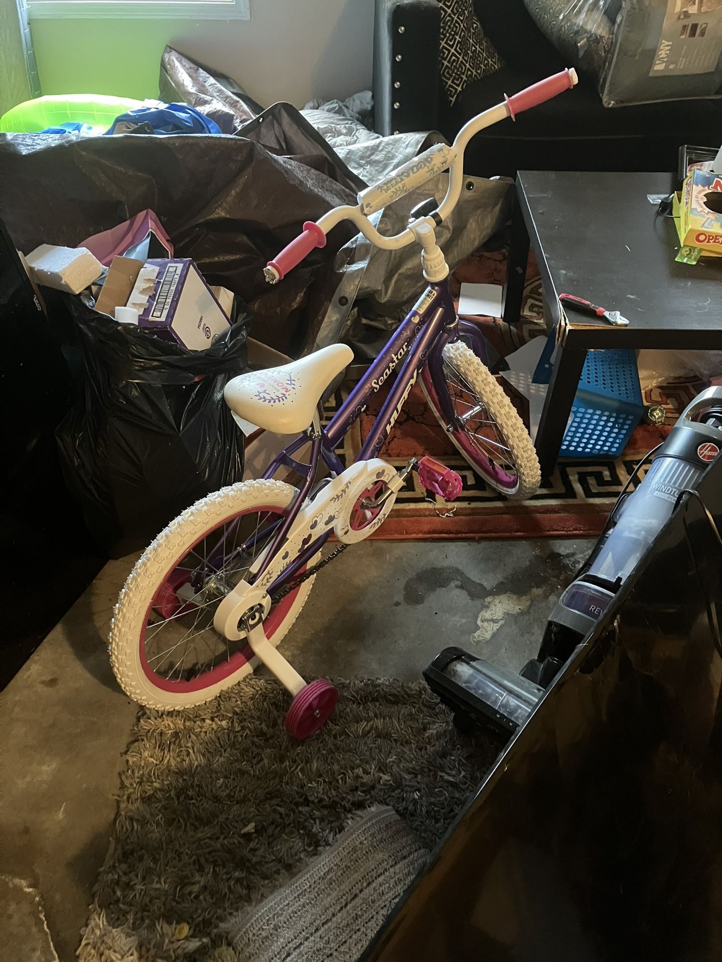 My daughter’s bike, she only rode it 4 times. She doesn’t like riding bikes, the wheels are still white and you can unscrew the training wheels to make it a regular bike.