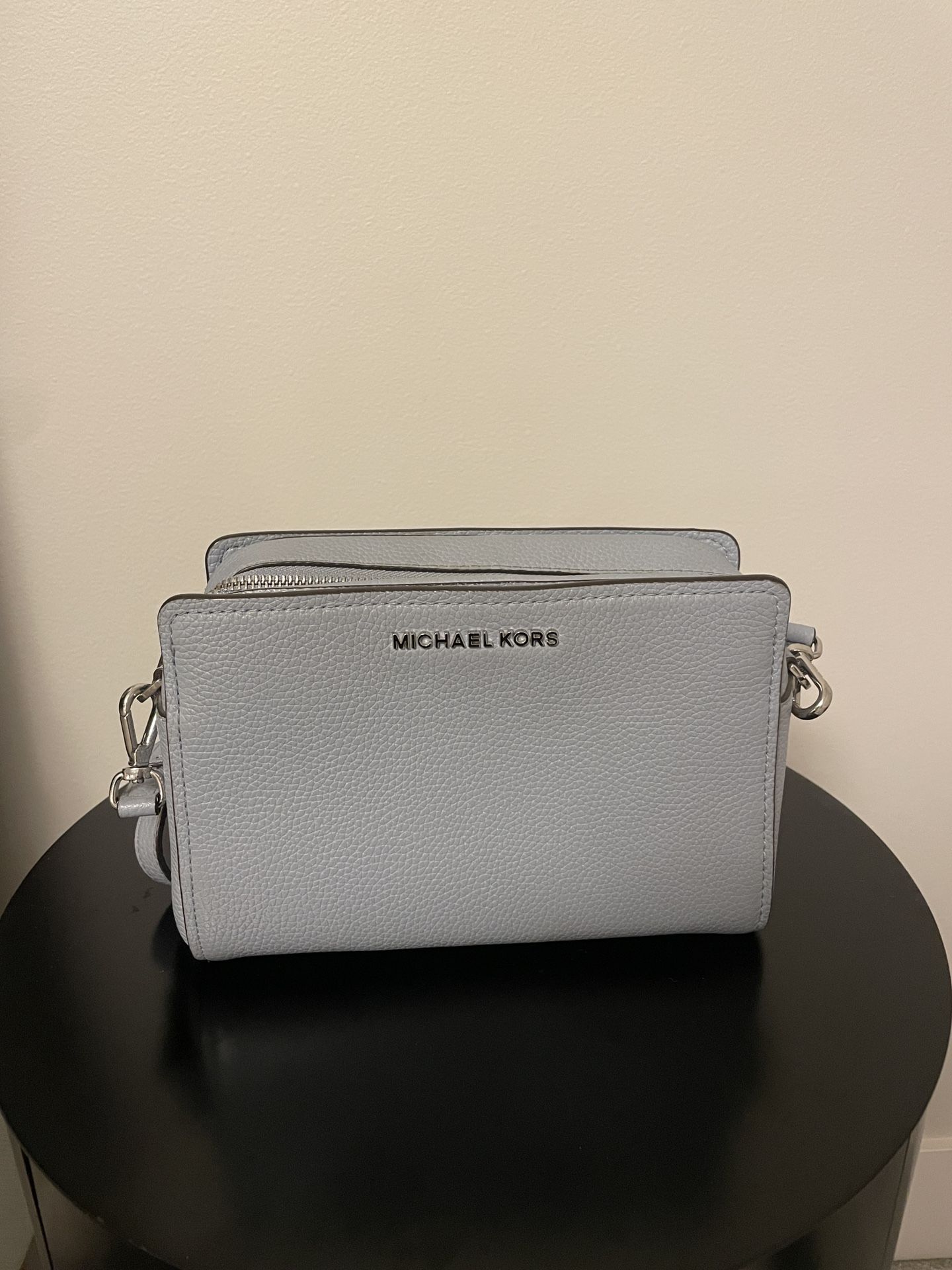 This crossbody bag was lightly worn and is in like-new condition. It's in a beautiful light blue shade with silver detailing. Has 3 departments and comes with a shoulder strap.