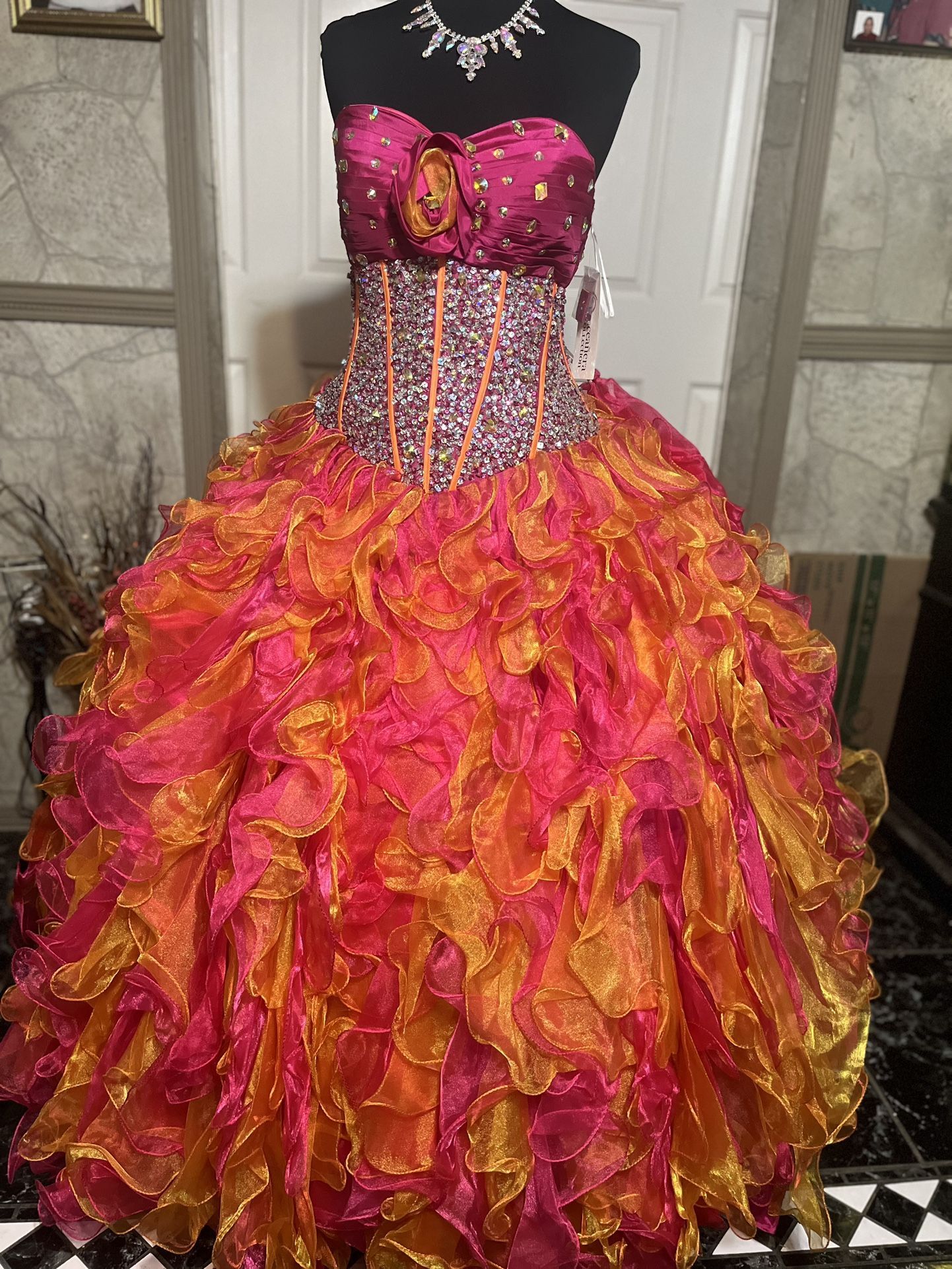 Authentic Quinceanera Collection Dress Color: Orange/Fuchsia Style: 26709 Size: 6 (corset can fit a size 4-8) Message me if you have any questions or are interested in this dress.