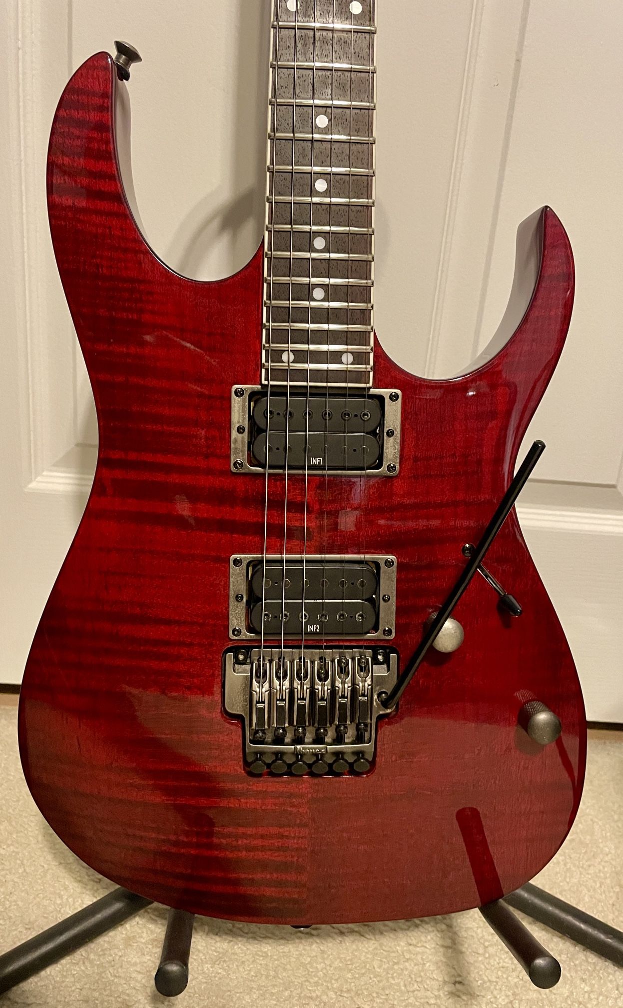 Amazing opportunity to get your hands on this beautiful 2003 Ibanez RGT with an amazing flamed maple top made in Korea. In incredible condition for a 21 year guitar! This guitar has an amazing sustain due to the neck through body and Mahogany wings. Beautiful rosewood fretboard, polished frets and in great condition! Just setup professionally and with Ernie Ball 9-42 strings. Super low action (1st string: 1mm at the 12th fret & 6th string: 1.25mm), perfect intonation. A true gem, great for shredders!