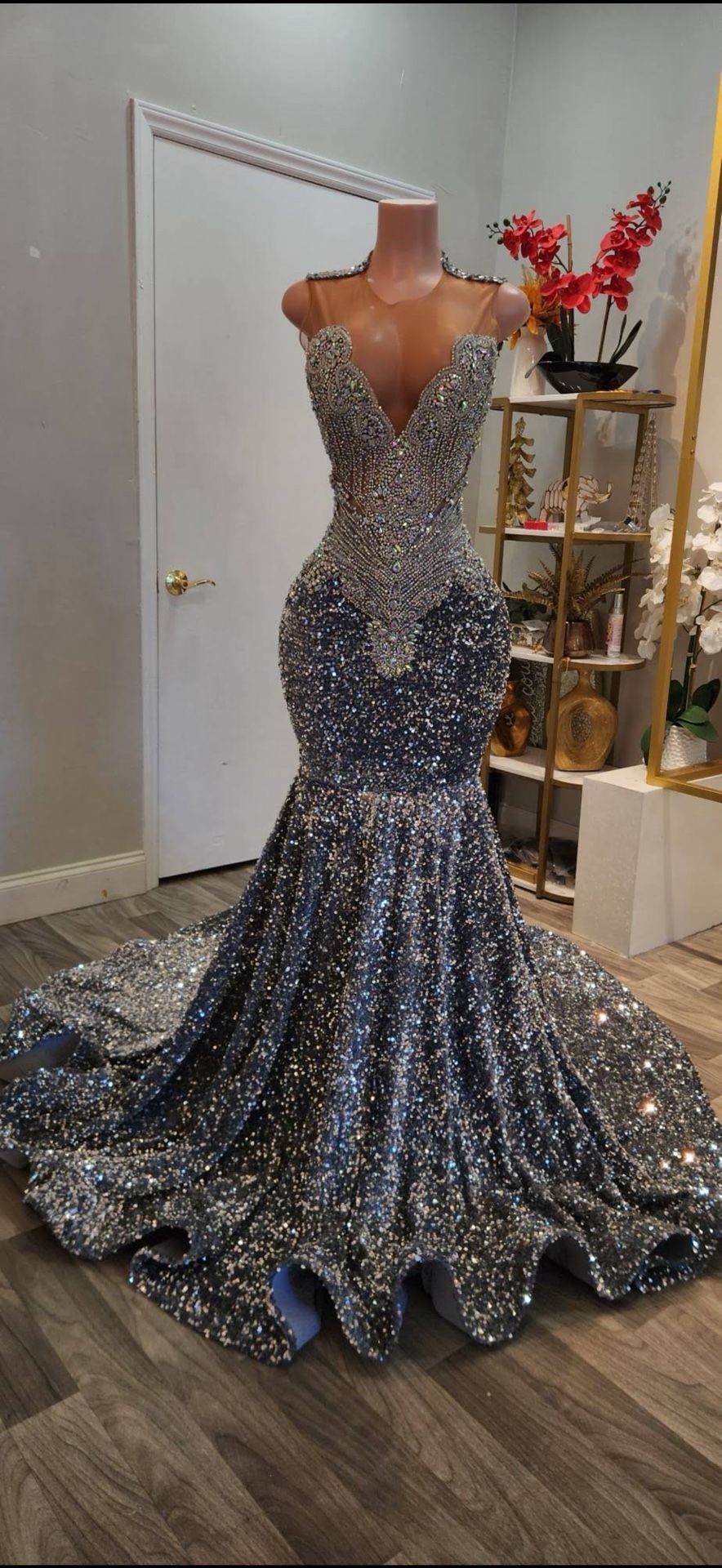 Stunning fully rhinestone and sequin mermaid prom dress. Features a deep illusion V neckline, fitted bodice, and dramatic flared train. Super sparkly and perfect for prom, pageants, or formal events. Only worn once Original Price $1,800.00 boutique gown