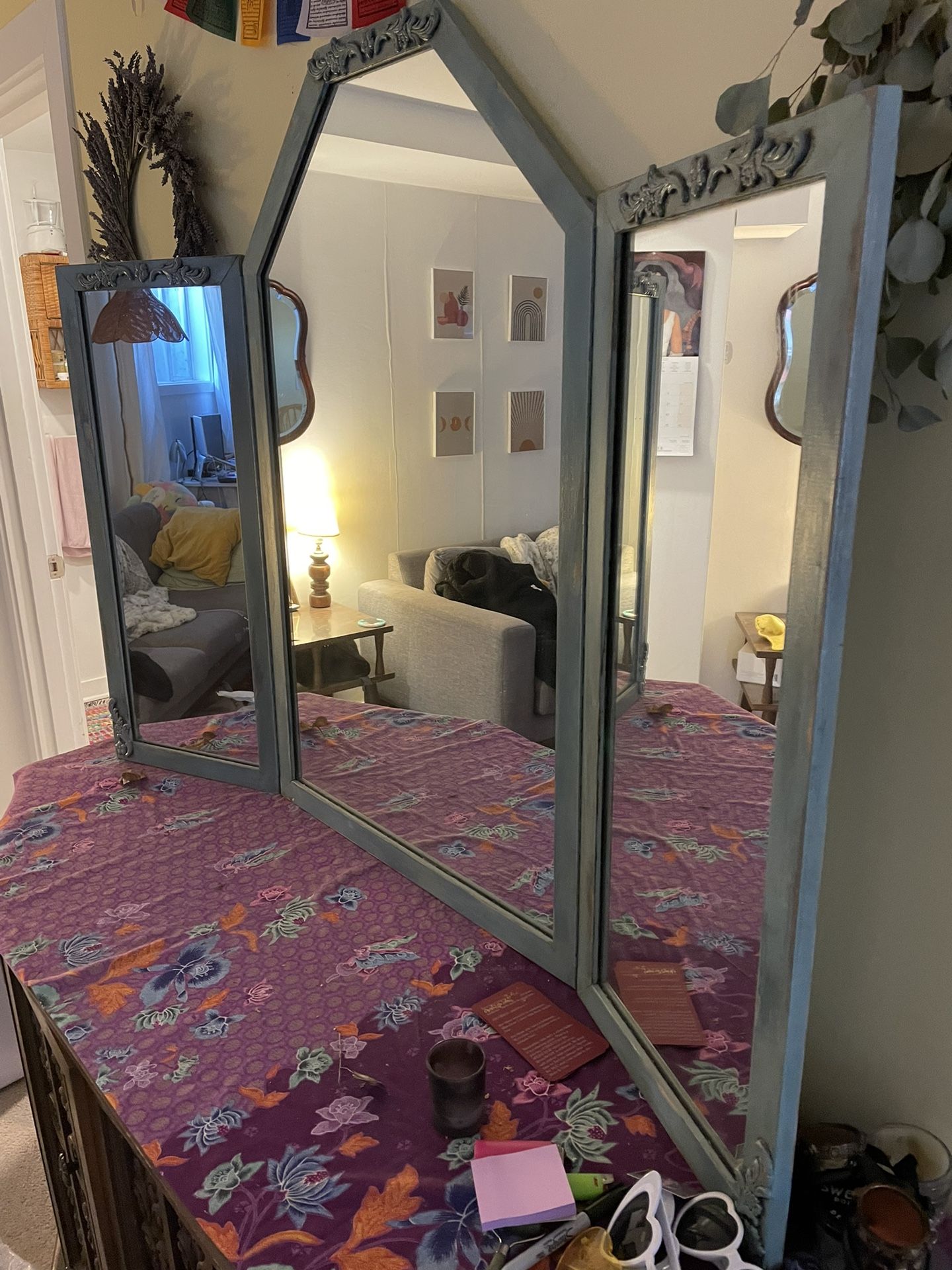 Beautiful handmade vanity mirror, teal color. 41.5 inches tall at tallest part x ~52 inches wide