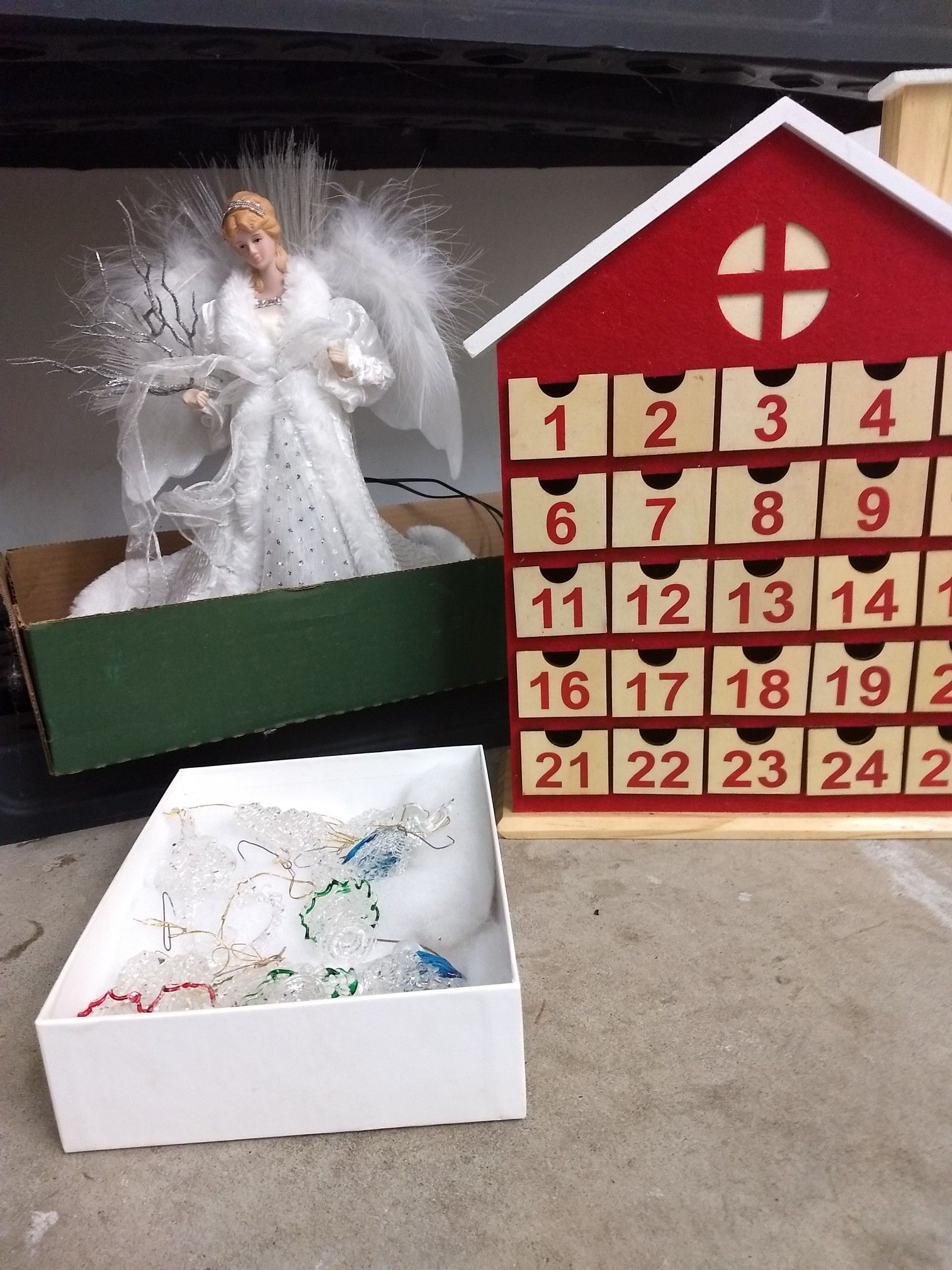Color changing angel tree topper. Set of glass ornaments, 1 angel has a broken top. Church with drawers that open.