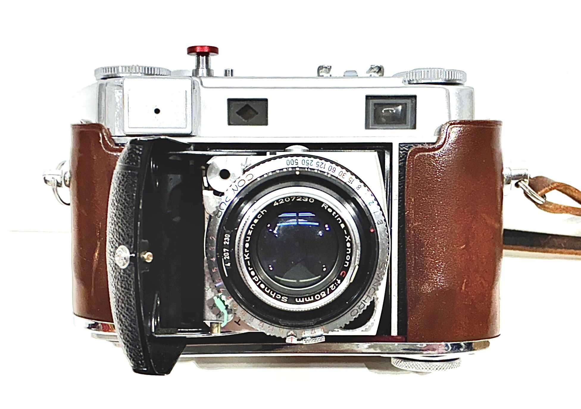 This Retina was tested by me running film through it. The negatives were scanned and sent to me for post production. The meter functions properly both with reflected and incident light readings. Shown is a patch I placed on the leather cover since it seemed rather worn in that place. This is a fine functioning camera. It was produced just before they manufactured their Retina Reflex. This is one of the very best German thought out, engineered, and built cameras of that era, bar none!Open to any respectful offer.
