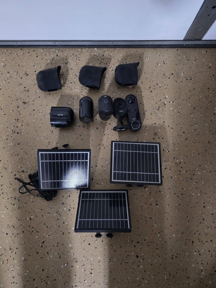 For sale are: Alro door bell Alro indoor camera with privacy shield when not in use or disarmed X3 arlo pro 4s with spot light function (and battery packs). X3 solar panel plug and play kit. Kit all works and will need the arlo app to run.