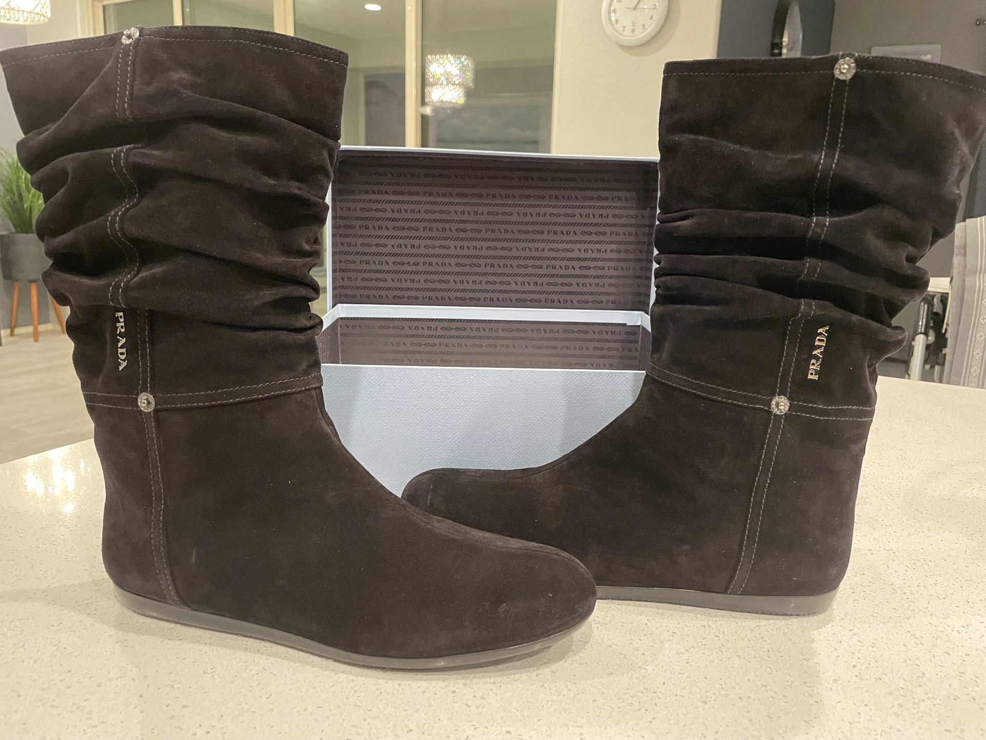 PRADA SLOUCH MID-CALF FLAT BOOTS, SIZE 38.5