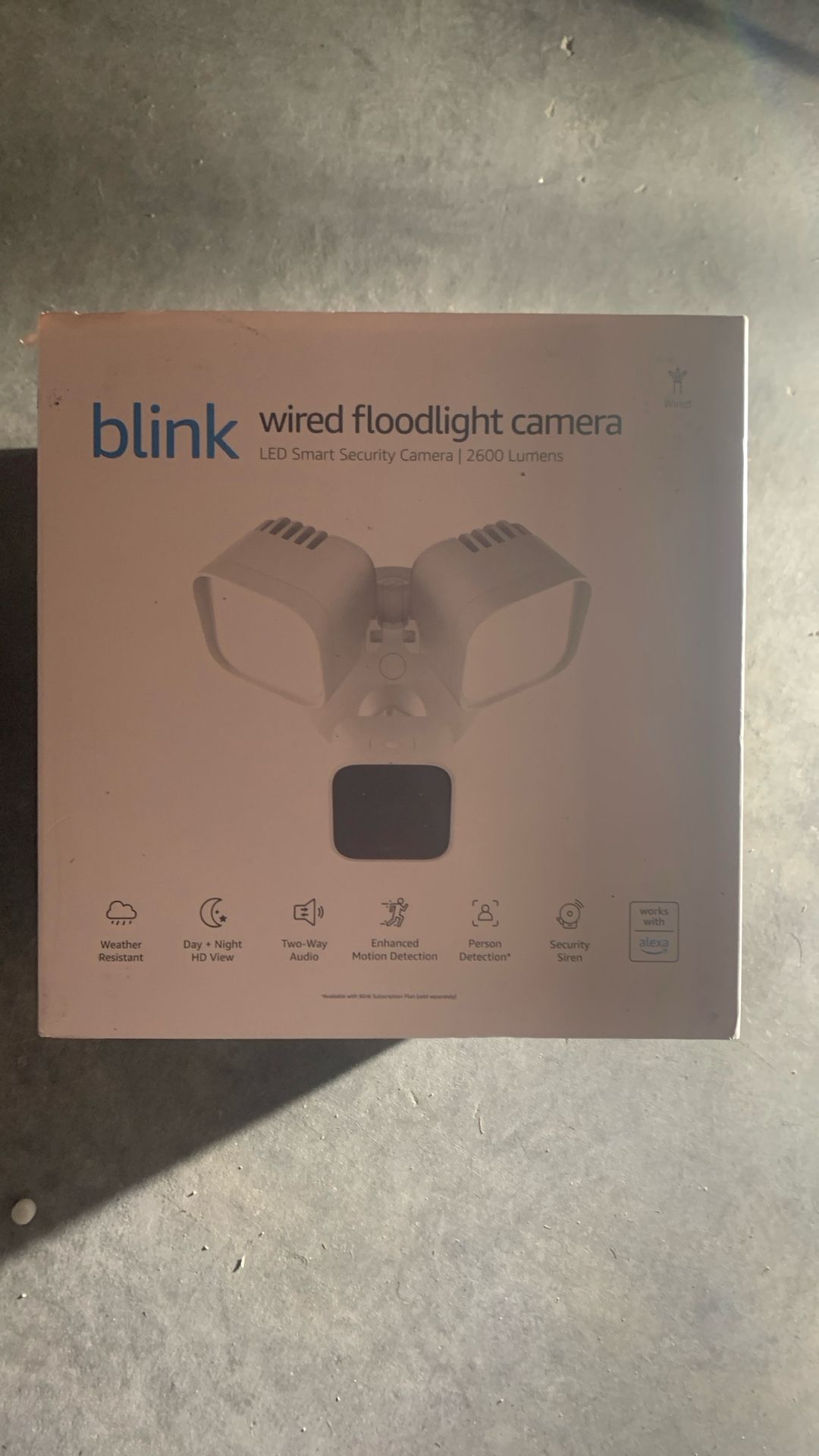 Brand new still in original unopened box running off WiFi, blink floodlight camera with, security siren, day and night HD view, two way audio, works with Alexa, enhanced motion detection, and person detection. A great camera for the price , sorry to see it go but need money to go towards bills.
