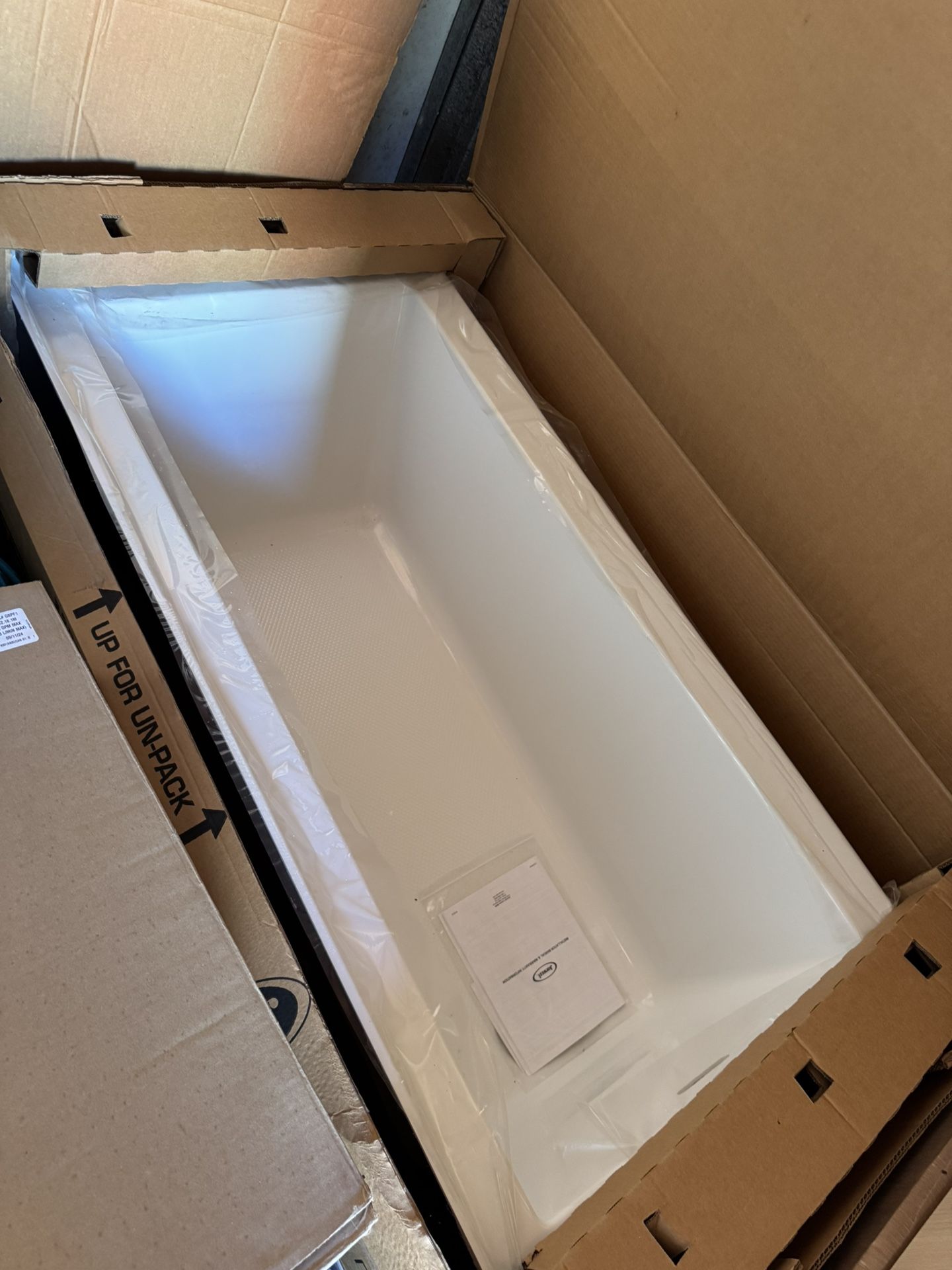 Brand New Jacuzzi Luxury Bath – Primo® Soaking Tub 🔹 Model: LNS6030BLXXXXW 🔹 Size: 60” x 30” – standard alcove bathtub 🔹 Color: White 🔹 Left-hand drain 🔹 Textured bottom surface for slip-resistance 🔹 Comes with original box, installation manual 🔹 Never used, never installed ❗Note: Small cosmetic chip on the rim from shipping (see photo). Doesn’t affect function or structure – easily repairable or can be caulked when installed. ✅ Still in factory packaging ✅ Perfect for renovations, house flips, or rentals