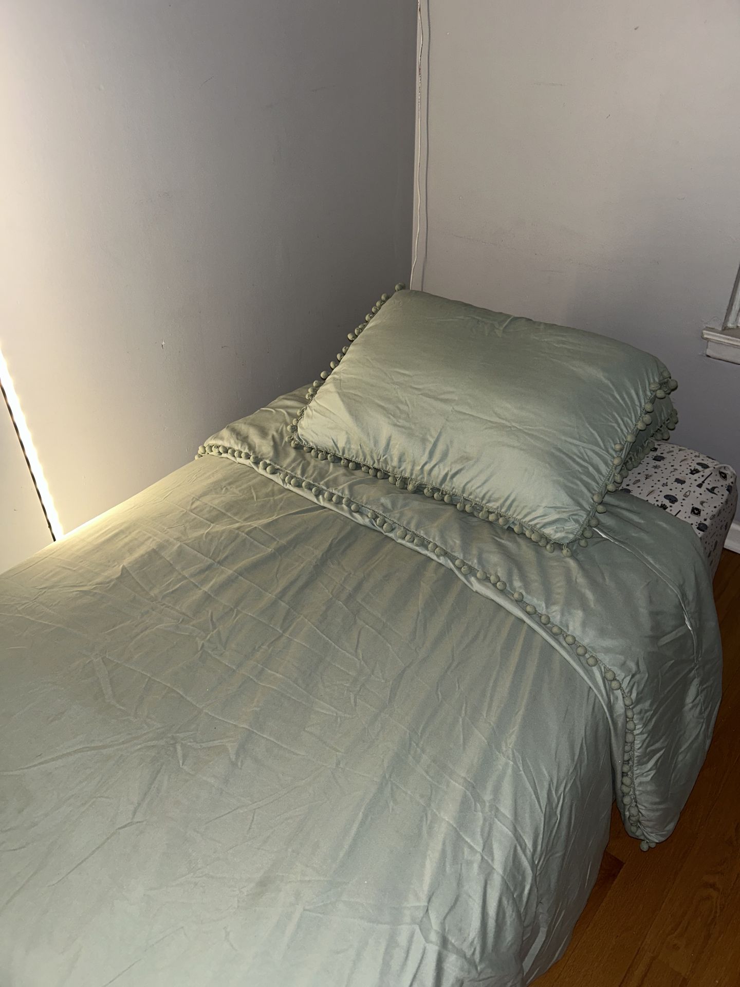Selling this Sage Green Duvet set - DUVET INCLUDED The duvet is already attached to the cover, the sheets are ultra soft & I loved the color. The sheets fit a TWIN bed. Keeping it stylish for your kiddos :)