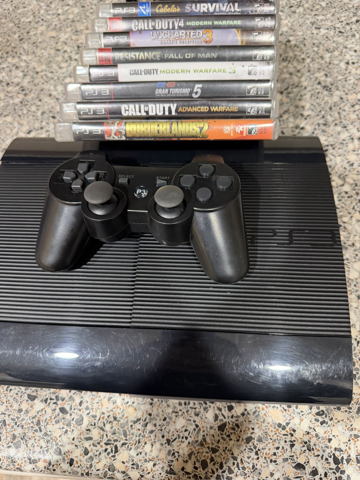 Works great comes with all cords 1 controller and 8 games DVD Blu-ray Cabelas survival l Cod 4 modern warfare Uncharted 3 Resistance Cod modern warfare 3 Gran turismo 5 Cod advanced warfare Borderlands 2