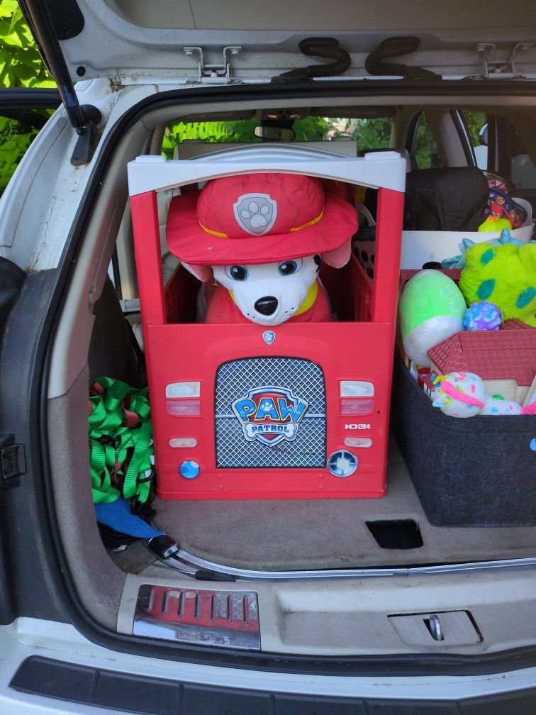 Paw patrol Marshall toddler riding toy with his own parking garage Gently used but charges and works perfect I have cleaned him and the toy garage to remove any scuffs or dirt marks The power wheel dog does not go very fast as it is intended for a child Comes with charger
