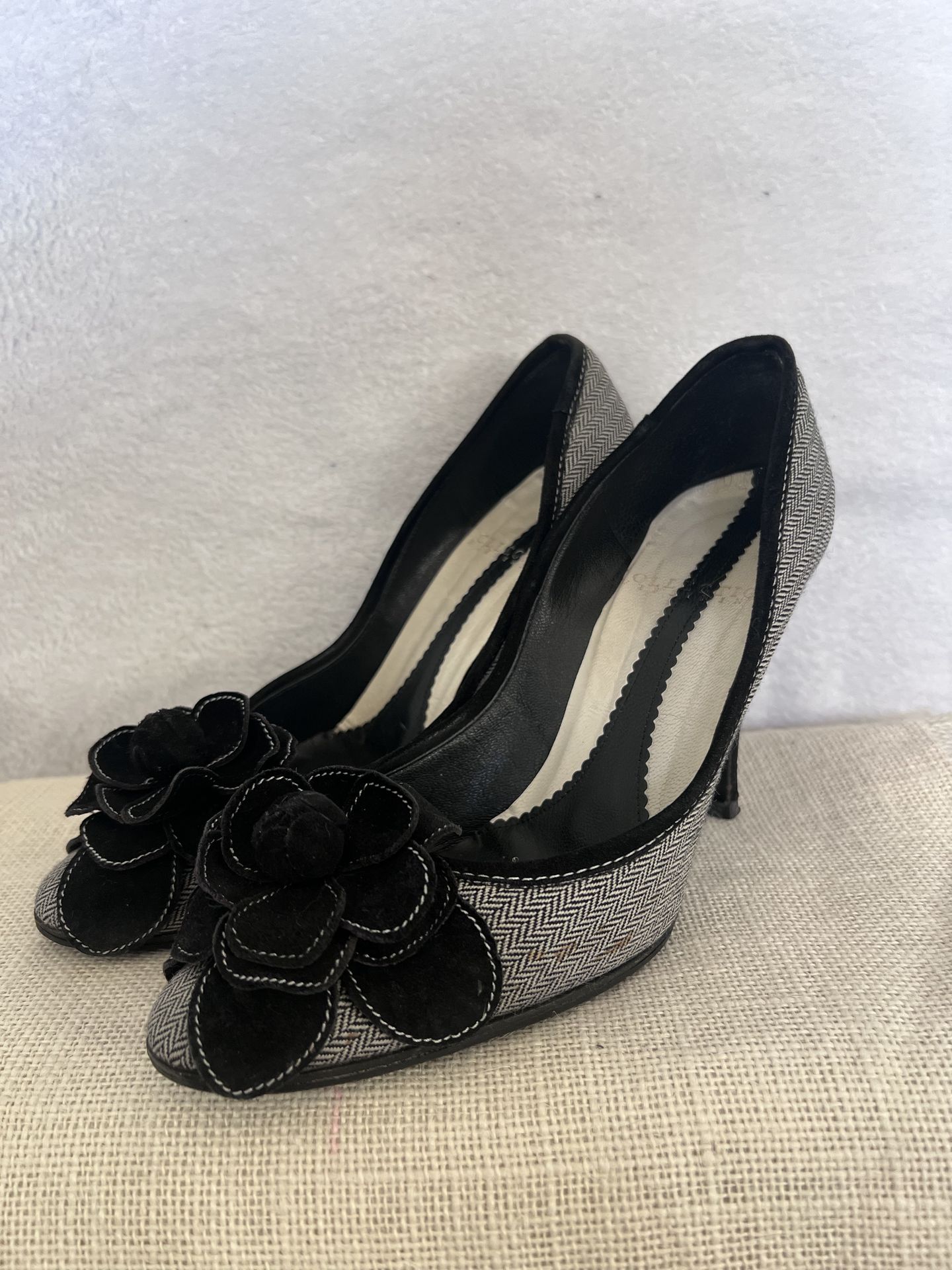 Collection 59 sophisticated gray and black herringbone pattern. These heels are elevated by a dramatic oversized, black suede style floral at the toe perfect for adding a “preppy check” or vintage inspired attached to your office attire or evening look size 36 1/2 with 3 1/2 inch heels. Pick up only cash only open to offers. :)