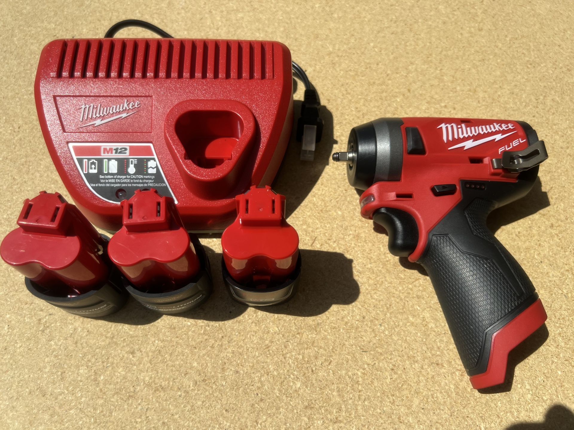 Brand new unused Milwaukee impact with 3 batteries and charger. 2 Ea 2.5 batteries 1 Ea 2.0 battery.