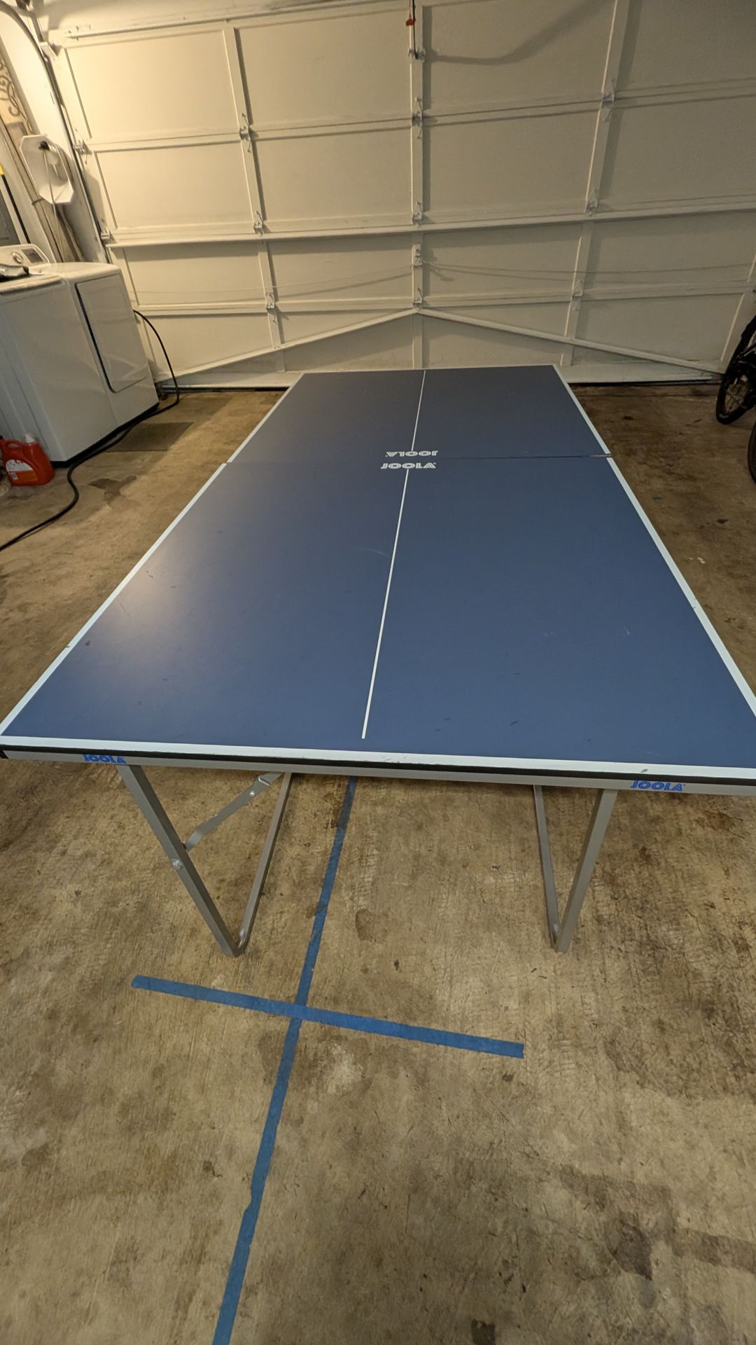 Sturdy JOOLA ping pong table. Blue top with white lines. Folds up for easy storage when you're not playing. Great for game nights or just practicing your serve. Fully functional, in one pane the back side is having minor issue and doesn't fold fully , you can see in the last pictures.