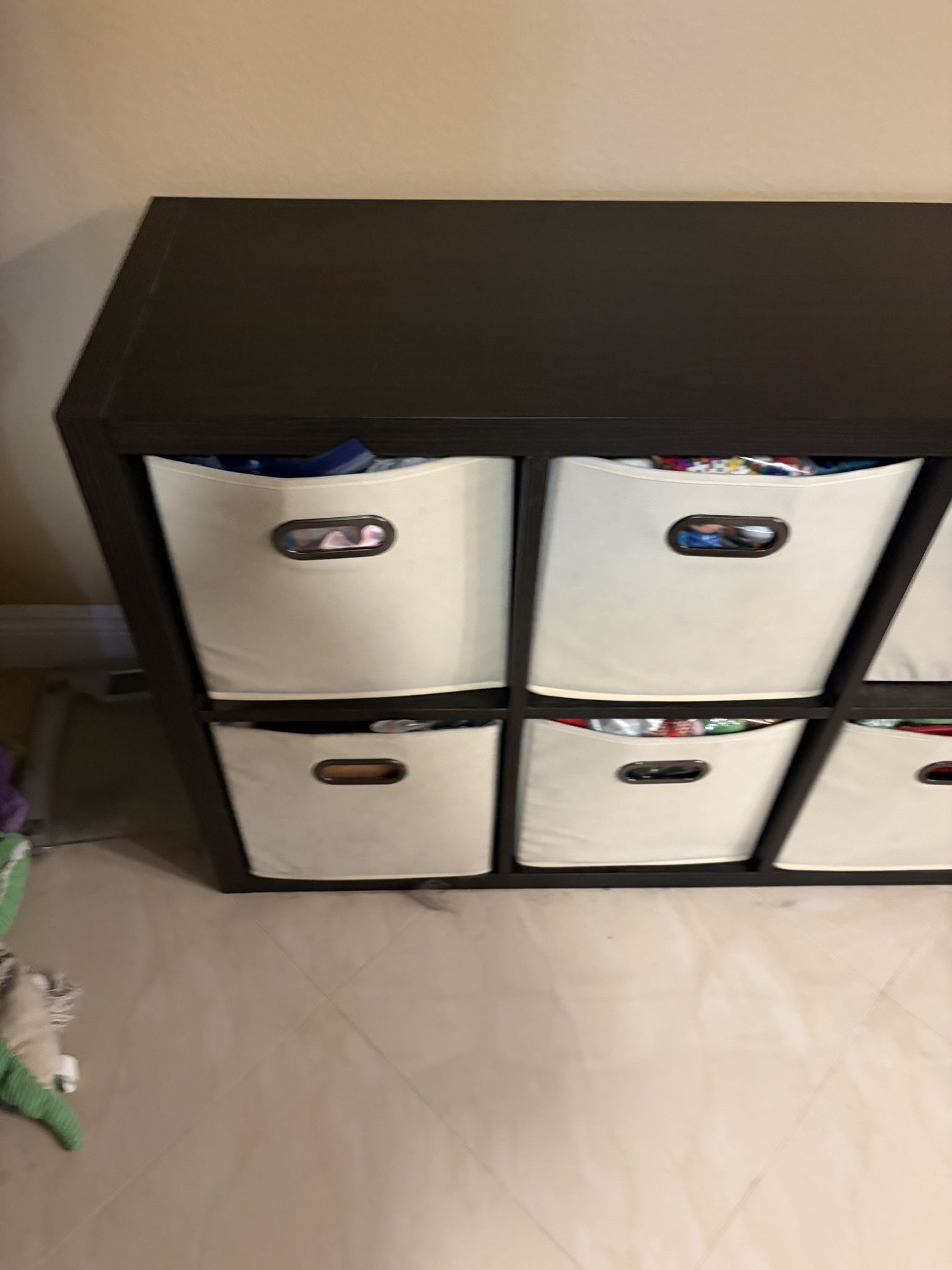 3 Black Cube Storage Shelves with Fabric Bins – Great Condition Sturdy black cube storage shelf with 8 fabric storage bins included. Perfect for organizing toys, clothes, books, crafts, or household items. Clean, modern look that works well in a living room, bedroom, playroom, or office. Details: • 3x 8-cube storage units • Black wood/laminate frame • Neutral fabric bins with handles (all included) • Solid and stable • Gently used, good condition Approx. size: Fits standard cube bins (similar to IKEA-style units) Pickup only. Message me if interested or if you’d like more photos!