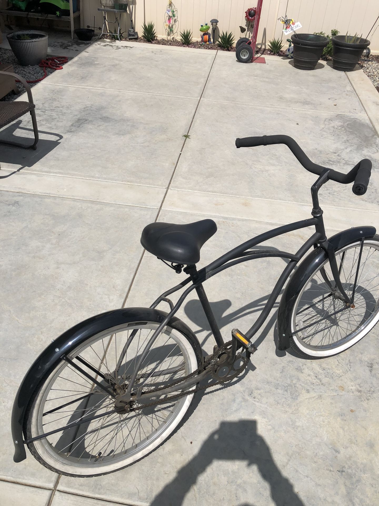 Good cruising bike. Missing piece back wheel attachment. Needs air. Frame good. Wheels good.