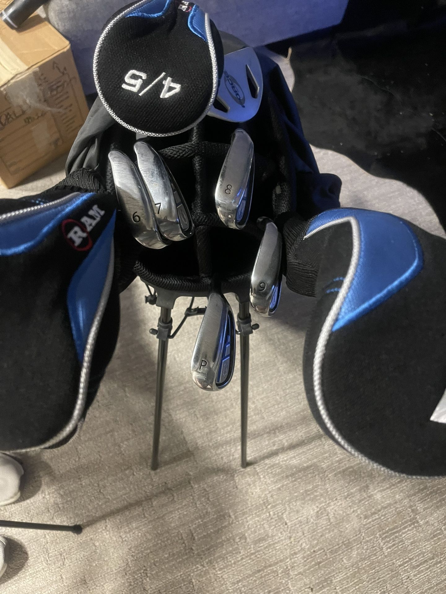 6-9 iron 3 wood 4/5 wood 5 And putter. Full set with bag. Used once when the owner shot a 8 on a par 3