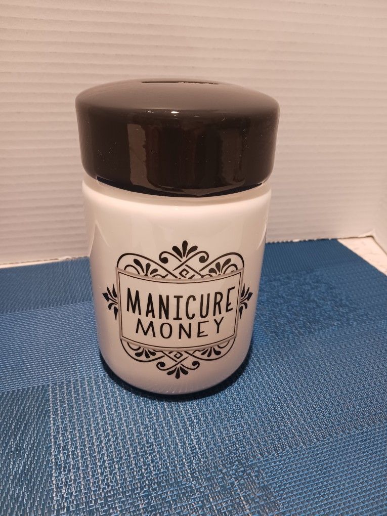 "Manicure Money" Ceramic Bank. Off White Jar With Black Lid. Jar Has Slot For Money. Rubber Stopper On Bottom Of Bank. Bank Mearsures 6" Tall. Never Used.