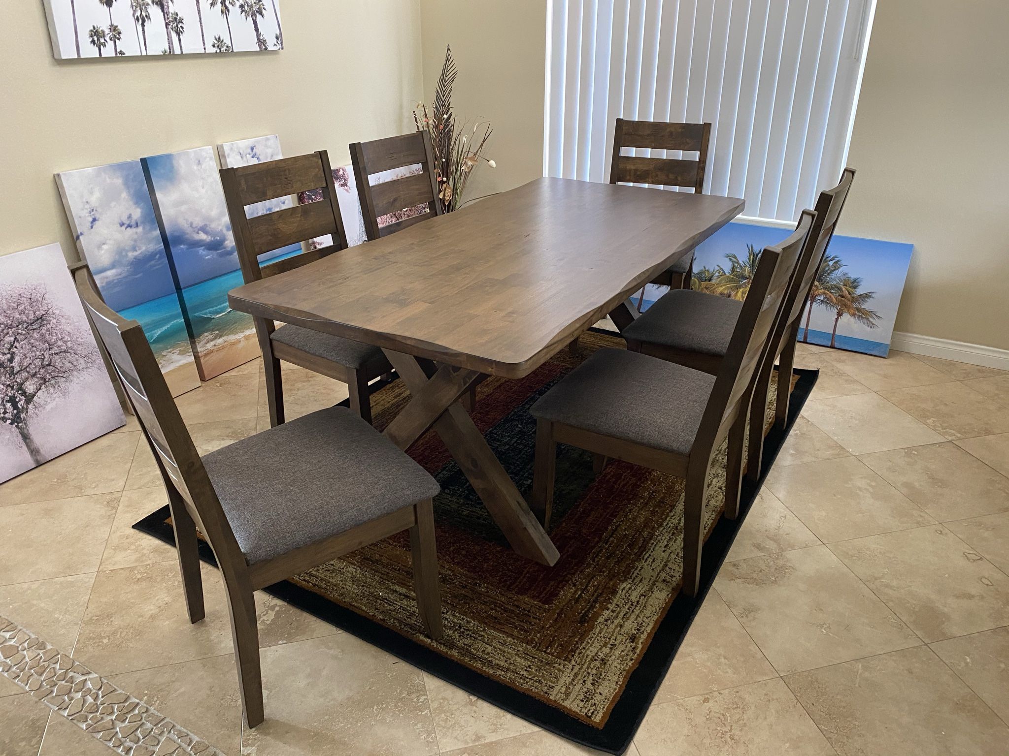 Beautiful Brand New Never Used High End Solid Shaped Edge Dining Table( 70"L x 35.5"W x 30"H) ** Table alone $345 firm** **Table and Bench $475 * Table w/6 chairs $795 * Table 4 chars and bench $775 I’ve got a truck for possible delivery **949*395*7495**