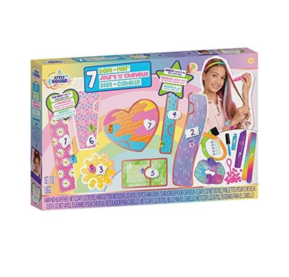 Brand new in box Make every day a self-care day, with 7 Days of Hair from Style Squad! Reveal a new hair surprise each day! Includes 7 surprises for hair-care fun all week long! Step up your style with hair beads, hair gems, a colored headband and scrunchie! With Style Squad 7 Days of Hair, you have everything you need for the ultimate at-home hair salon! Use the included hair highlighter, hair glitter, and ombre hair extension to elevate your look! MAKE EVERY DAY A SELF-CARE DAY! Reveal a new hair surprise each day! Includes 7 surprises for hair-care fun all week long!