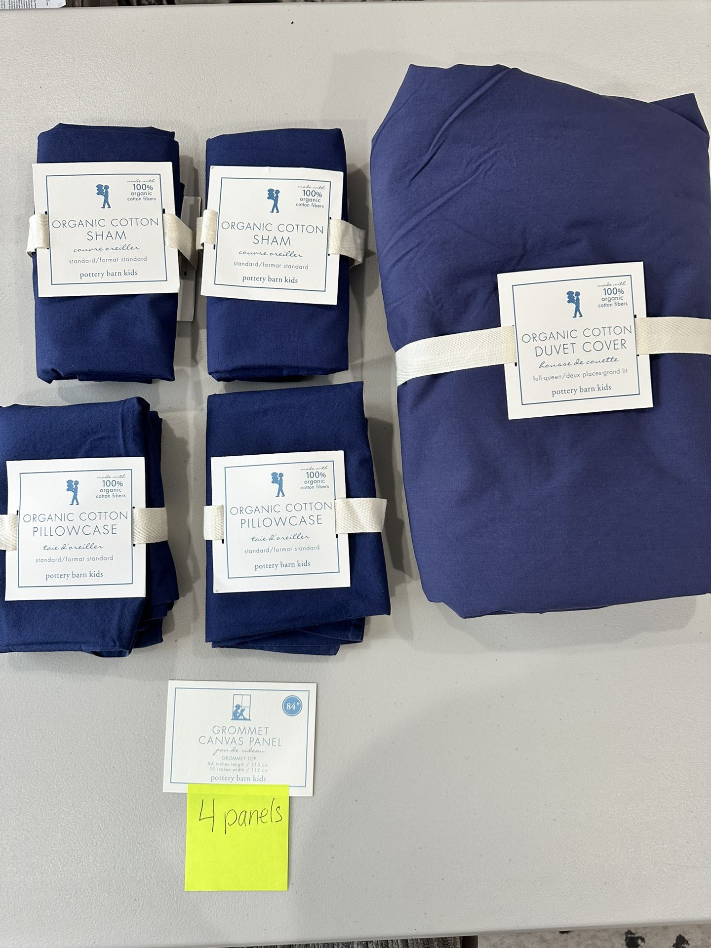 Pottery barn kids boys full size cotton bedding and curtain set in navy blue color Set includes: 4 - 84”x 50” grommet curtain panels 1 -duvet cover full size 2- standard pillow covers 2- standard shams 1- dark brown/black curtain rod with something that looks like a golf ball/baseball If it’s listed it’s available! Don’t waste your or my time. Serious inquires only set without tax is over $500 Changing out kids room decor