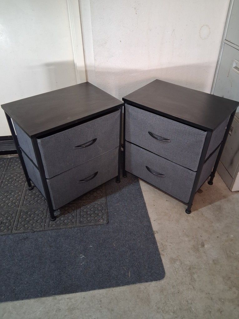 two-drawer fabric storage nightstand with a dark wood top and black metal frame.