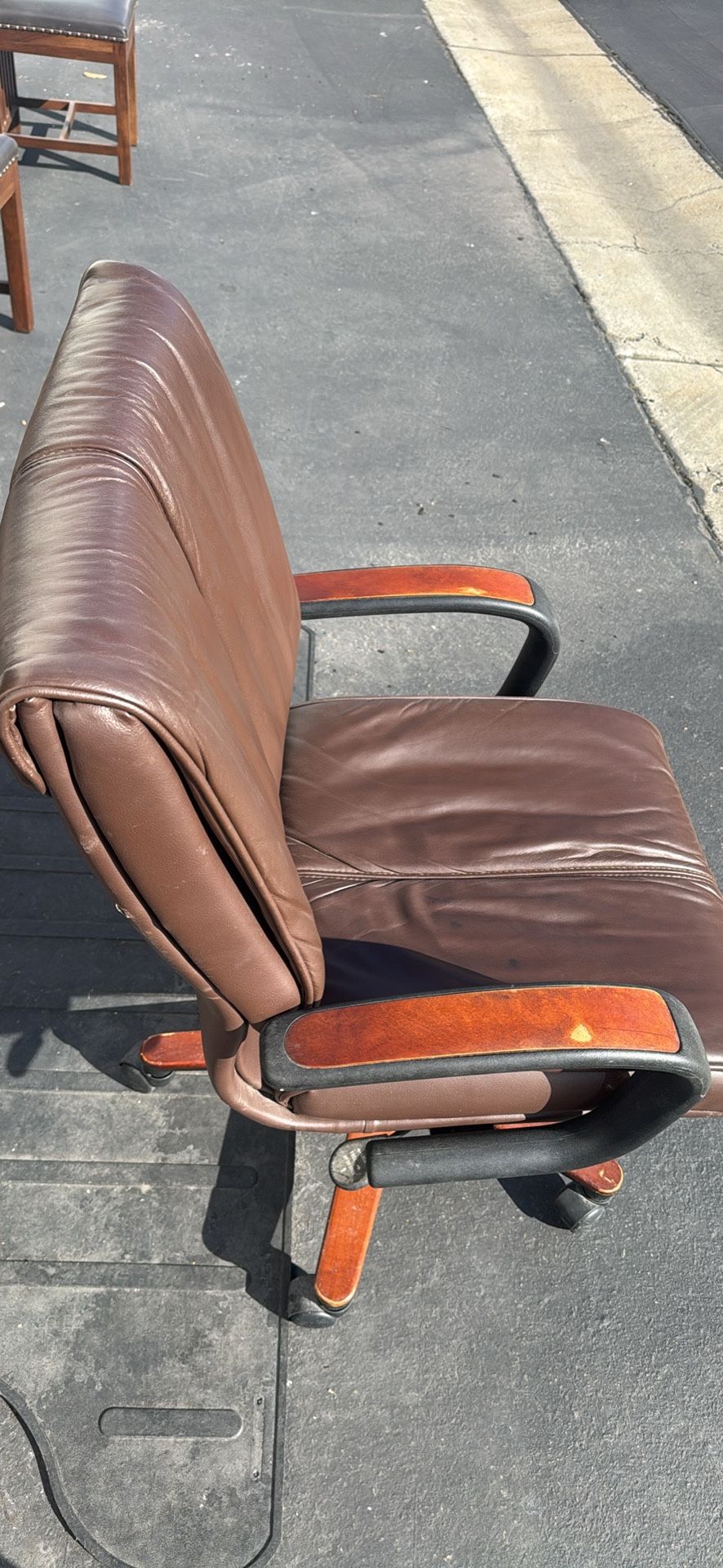 Leather back rest and cushion, with manual height adjustment control. Some chairs may have dust or small blemishes. $50 per chair, several in stock.
