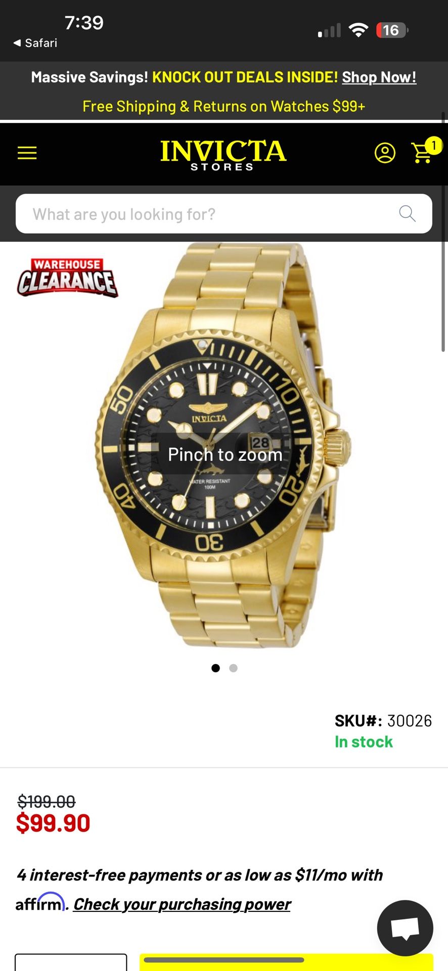 Invicta Pro Diver Men's Watch - 43mm Brand New in box Never Worn Dial Color Black Dial Material Metal Case Size 43 Case Tone Gold Case Material Steel Bezel Function Uni-directional Crown TypePush Luminous ColorWhite Luminous MaterialTritnite Lot# 22
