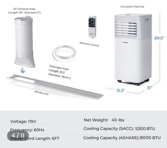 Brand new in box ,COSTWAY Portable Air Conditioner, 8000 BTU Ac Unit Spaces up to 230sq.ft, with Remote Control, 24H Timer & Window Venting Kit, Sleep Mode, Suitable for Bedroom, Living Room, Office (8000BTU, White)