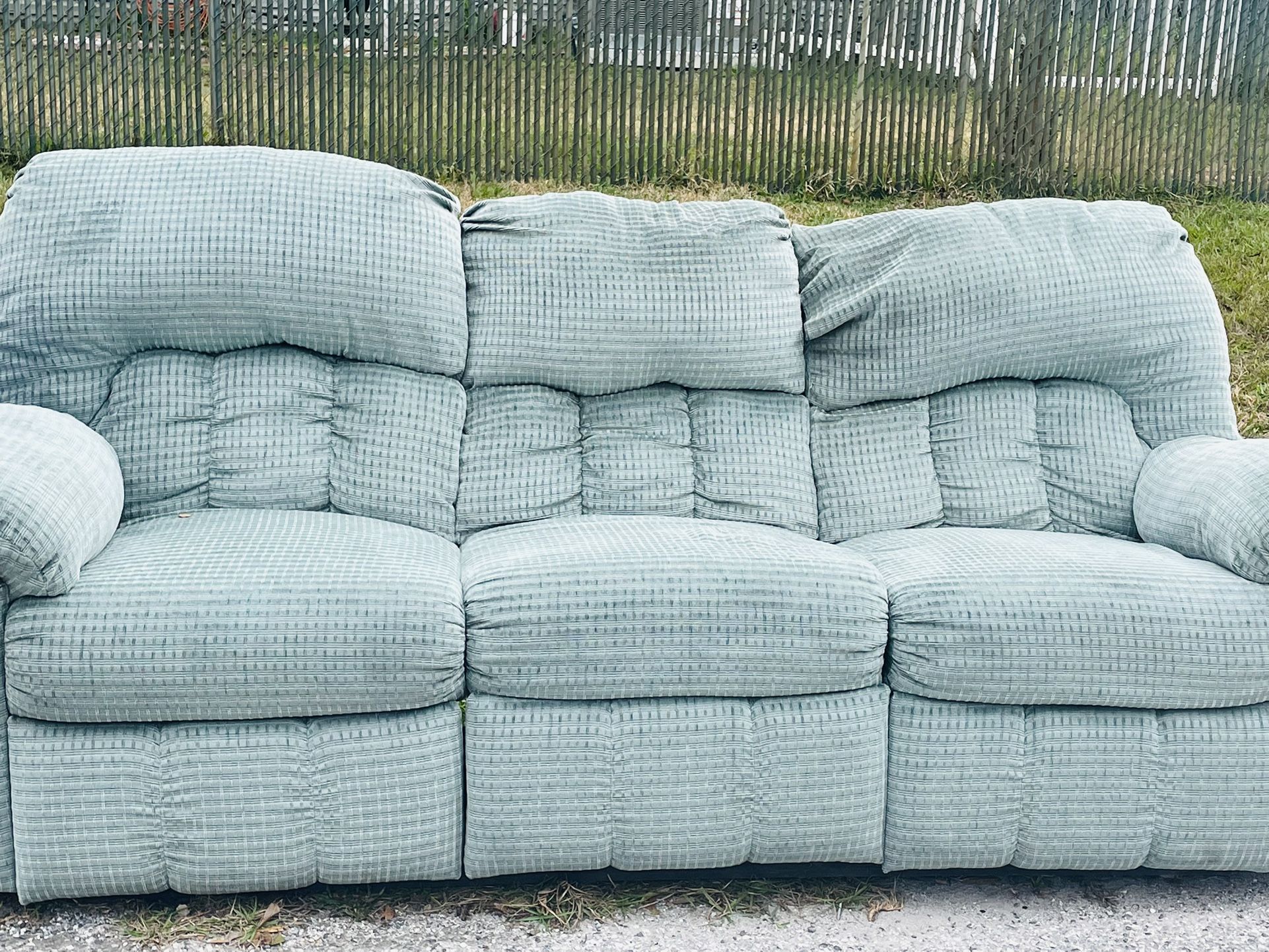 Very good quality sofa. No stains ! Very comfortable. Do have a husky but used cover and towels on cushions . So there is hair in the back . But if you need a sofa ๐๏ธ its free ! Curb side pick up Has a small tear in the seem can easily be fixed and would of done it but just had surgery . I also have a movie console love seat that will also go . Sofa has two recliners work great . And love seat is both recliners.