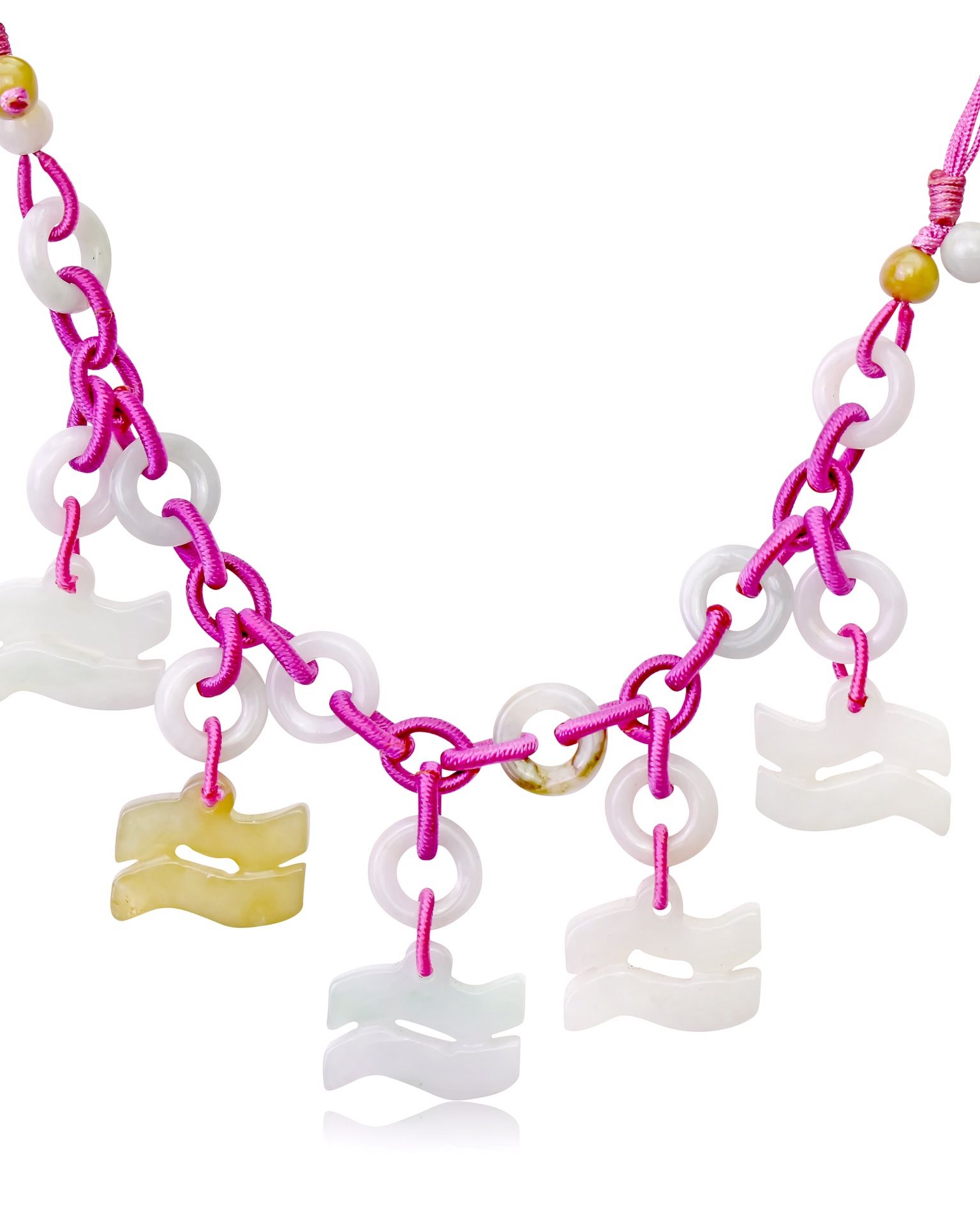 Show your pride in being an Aquarius with this Aquarius ZODIAC SIGN JADE PENDANT NECKLACE. This necklace features five Aquarius symbols hand carved out of high quality jade, strung up on a pink necklace cord using white beads and small chain link style pieces. It adjusts to the perfect length for you.