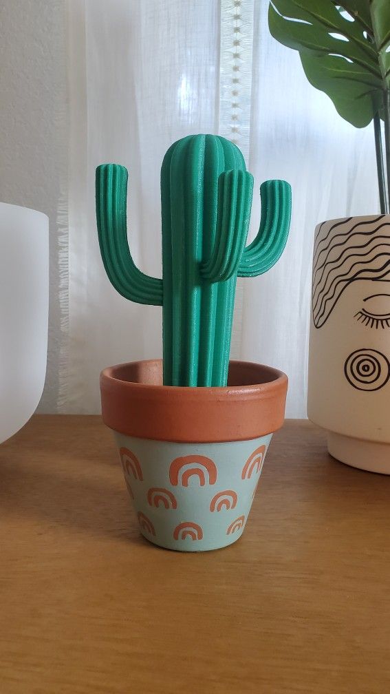 This cute little cactus has been custom designed and 3D printed in my workshop. Each one of these unique little cacti comes with a custom painted terracotta pot. The base has been weighted so it doesn't tip easily and the sand has been specially packed and hardened so it will not spill even if held upside down. The 3D printed plant based plastic is strong and durable and is designed to hold your scrunchies, hair ties or even bracelets. If the design on your pot is too much we also have cacti in unpainted pots so you can paint them yourself and create a truly custom one of a kind decoration for your home or creative space. More pot designs are on the way! Total height: 9.5 inches Arms: 3 Color: Green Pot: Sage green with terracotta rainbows.