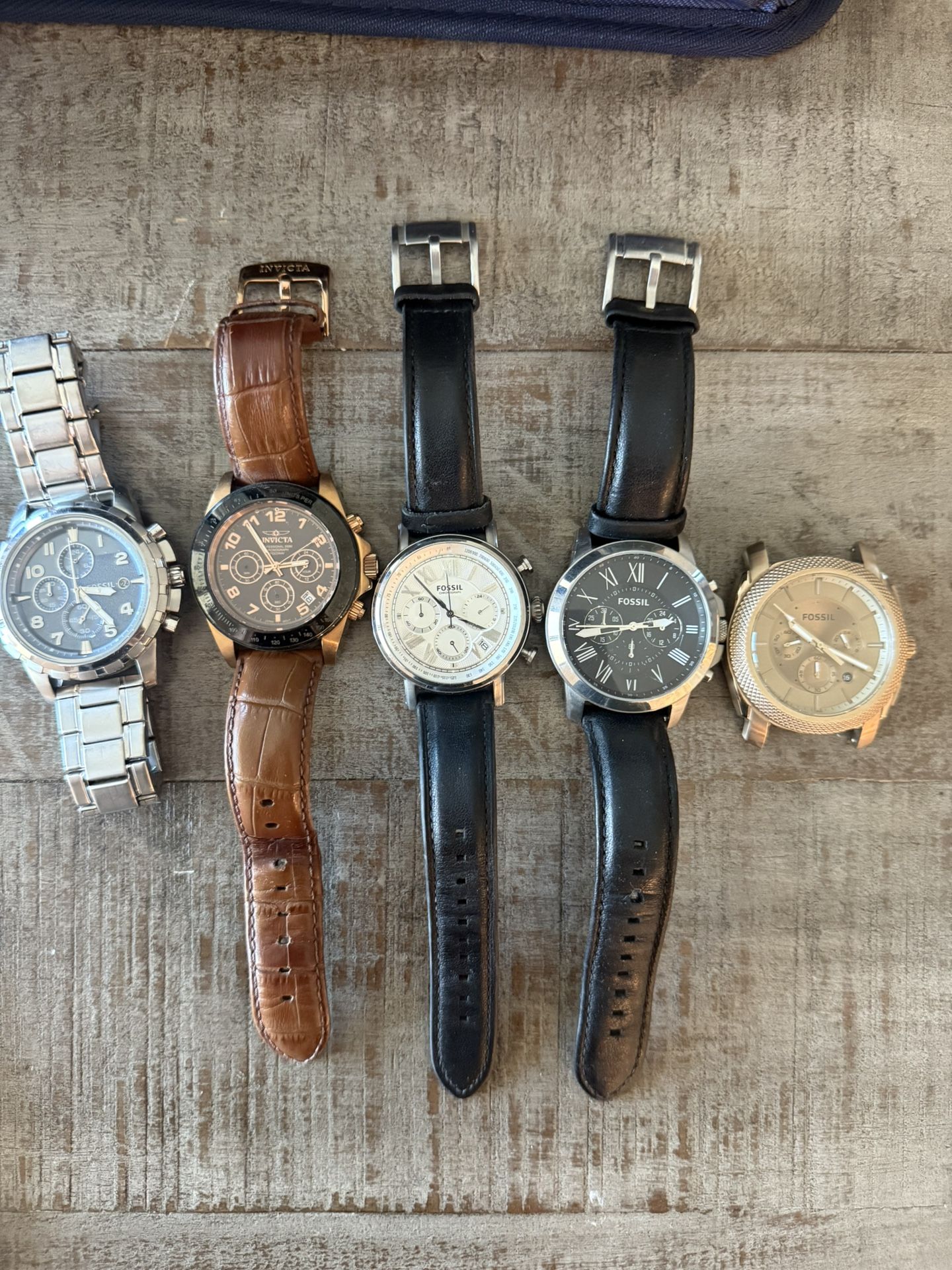 Fossil watch bundle, all batteries are dead. Original owner of these bought from stores. Dont wear them anymore and didn’t want to get new watch batteries. 4 complete watches 1 naked (missing straps the clasp broke so just took them off) $50 take them all