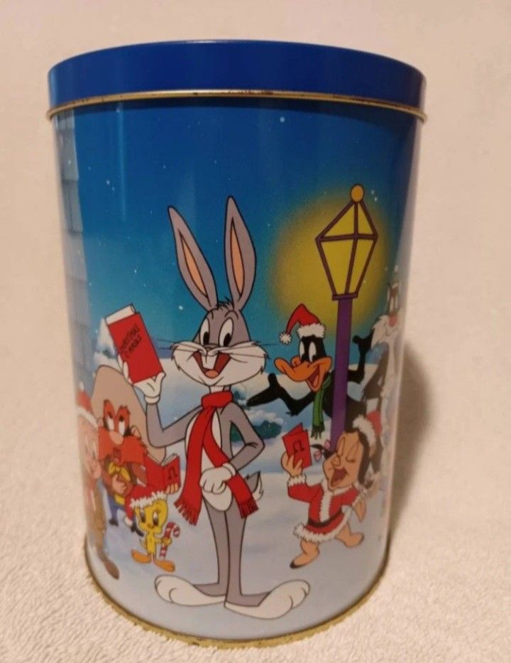 Celebrate the holidays with this vibrant Looney Tunes party tin . Featuring beloved characters in festive attire , this blue tin is perfect for storing treats or gifts . A must-have for any Looney Tunes fan . Measures 6 inches tall & 4 1/2 inches in diameter Metal material container . Featuring Tazmanian devil , bugs bunny , Tweety , Sylvester , daffy duck , porky pig , Peutina pig , Wile coyote , Mopar road runner , Yosemite sam , Elmer Fudd & Pepe Le Pew singing xmas choral . Gift idea for collectors or addition to your holiday decorations . Container made in England . Made for Branch's candy for Warner brothers in 1990 . Some discoloration on the golden rims as seen in the pictures . Not contain candy