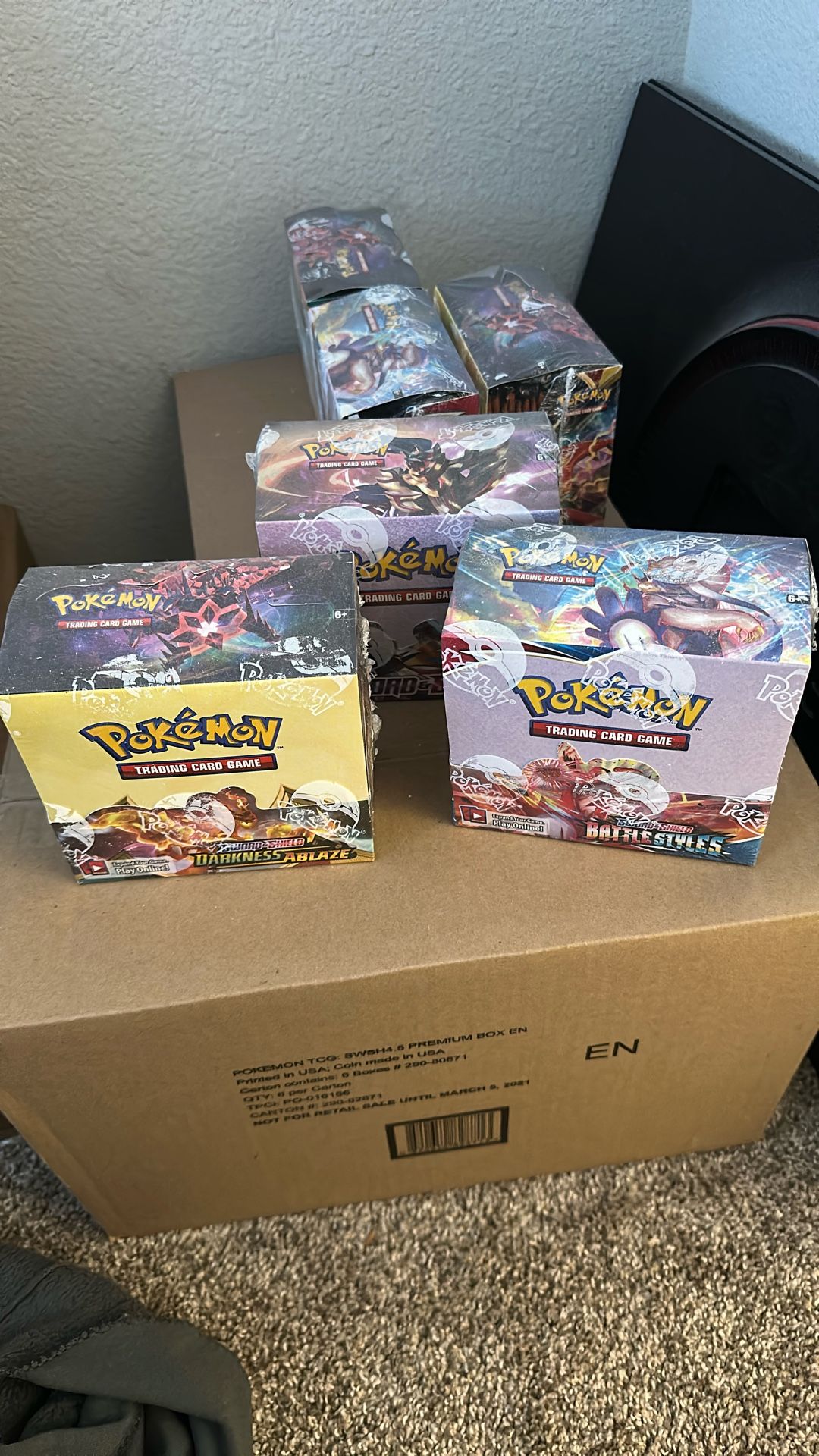 Boater boxes ETB and Tins available!! Darkness ablaze Battle styles Sword and shield Shining fates Vmax battle boxes also available 200$ is the price for battle styles booster box