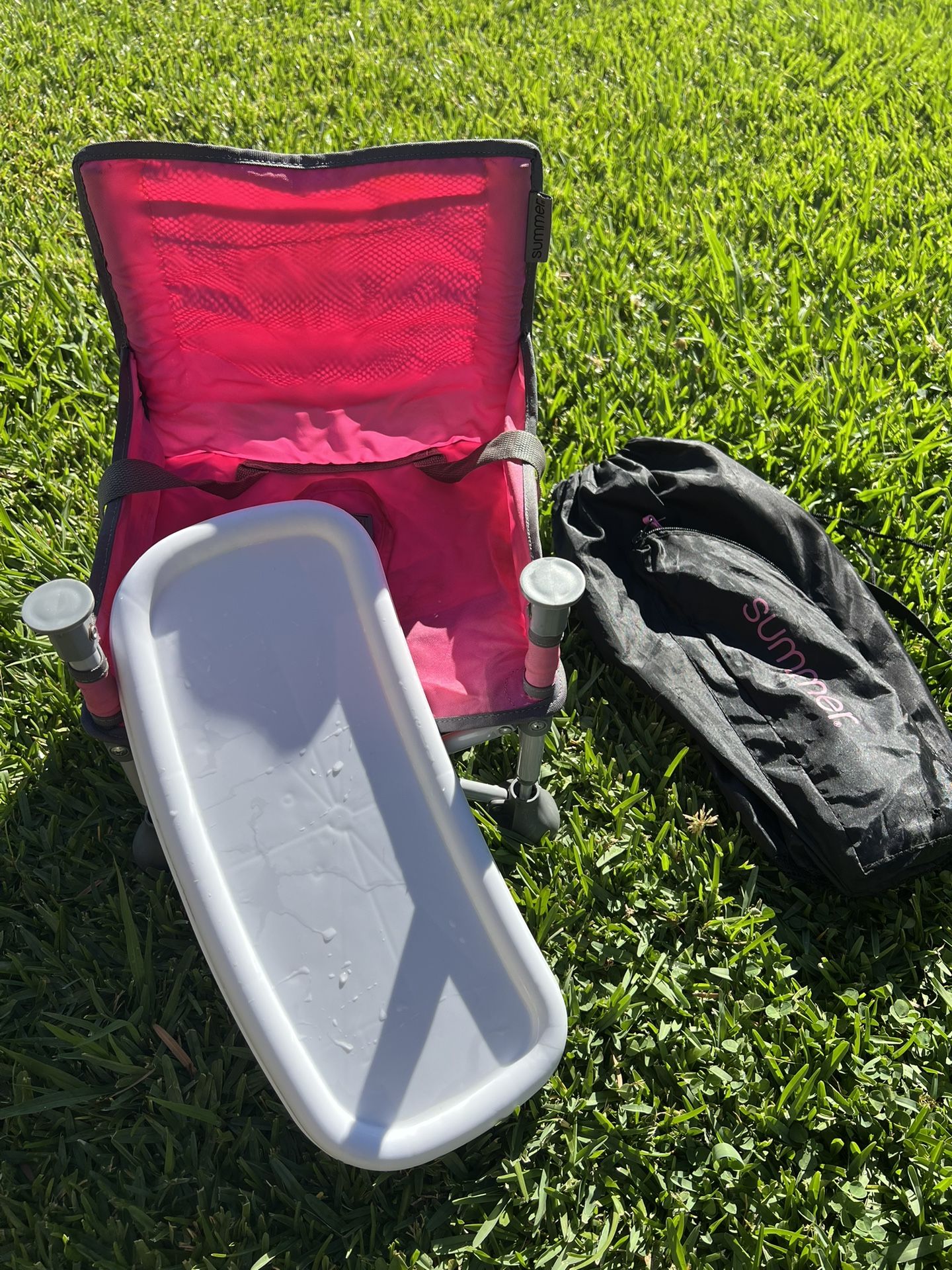 Bright Starts Pop 'N Sit Portable Booster, Indoor/Outdoor Use, Floor Seat with Feeding Tray, Pink, 6 Mos - 3 Yrs Summer Pop N Sit is the original go & grow seat! 3 modes of use: floor seat, feeding seat with removable tray, and toddler booster; great for days out, evenings in, weekend trips & more Safe for indoor and outdoor use. Pull up a seat for park picnics, camping trips, and visits to grandmas house; includes a carrying bag with shoulder strap to bring along on all your adventures Compact design easily folds to 5 x 15 inches; Easy to clean with dishwasher safe tray and machine washable seat pad; includes a rear storage pocket for little essentials Pink design for baby girl or boy; includes 3-point safety harness, BPA free tray, and safety straps for attaching to adult chair; rated for ages 6 months to 3 years or up to 37 pounds A must-have item for parents on the go, grandparents & more! Great gift idea for baby showers, birthdays, Christmas, and other gifting occasions; no tools required for assembly
