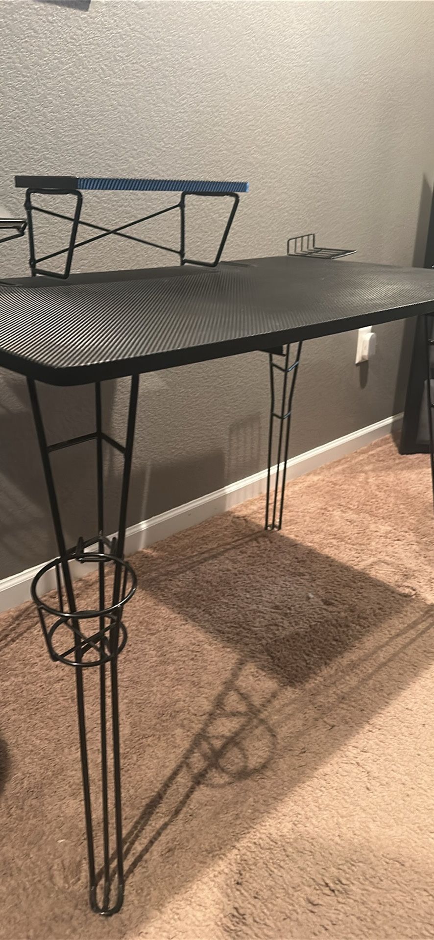 Upgrade your setup with this sturdy and functional gaming desk designed with gamers in mind. Built with a durable metal frame, it offers plenty of space and smart features to keep your area organized and comfortable. • Condition: Like new • Dimensions: 3’4” (40”) L × 23” D × 27” H • Built-in monitor stand for better screen height • Cup holder & headphone hook for convenience • Cable management system underneath keeps wires neat • Sturdy metal frame with sleek black finish Perfect for gaming, streaming, or even a home office workstation.