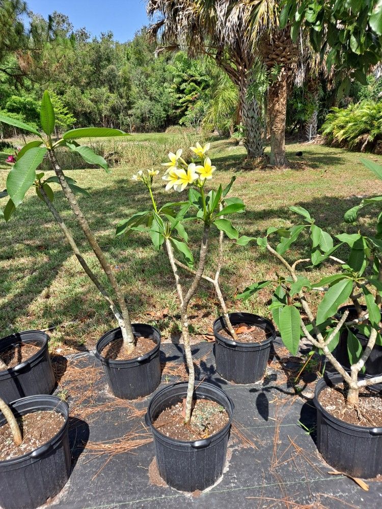 Home grown Plumeria plants in 7gallon containers. Mostly yellow and some pink very frangrant. Now in bloom